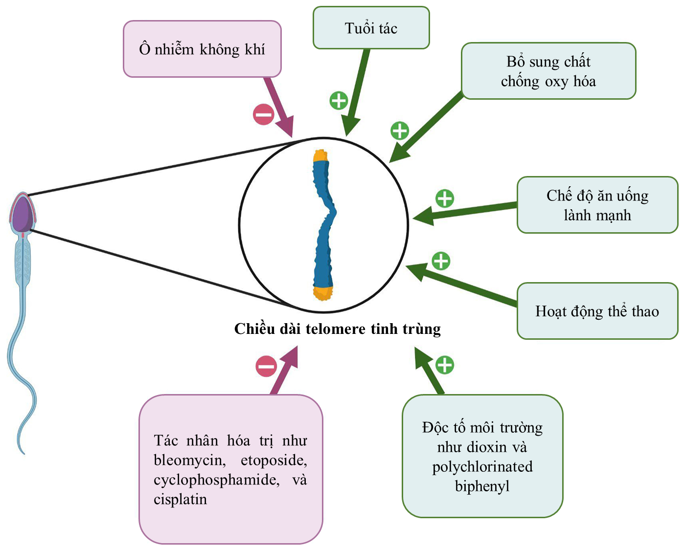 Hình 1. Các yếu tố tác động đến chiều dài telomere tinh trùng.