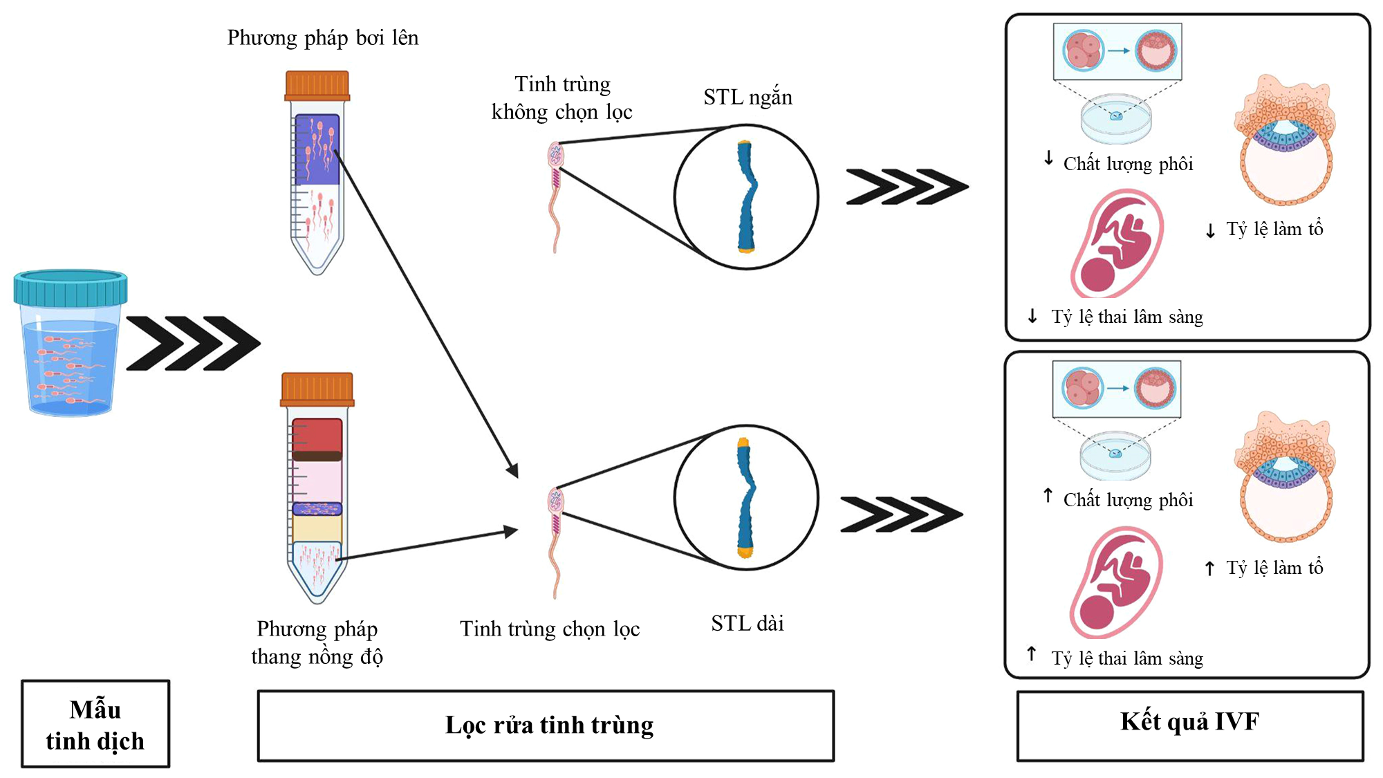 Hình 2. Tác động của việc chọn lọc tinh trùng STL dài thông qua kỹ thuật bơi lên hoặc thang nồng độ đến kết quả IVF.
