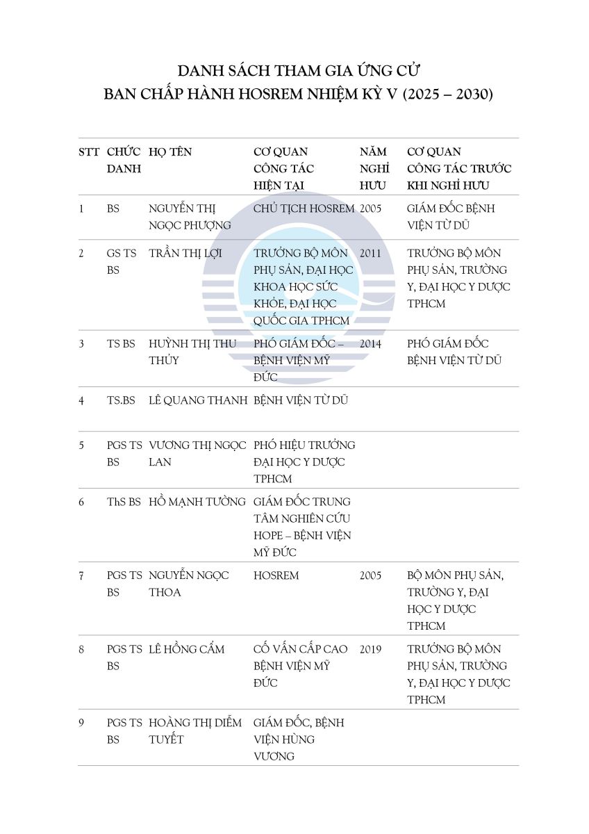 DANH SÁCH THAM GIA ỨNG CỬ BAN CHẤP HÀNH HOSREM NHIỆM KỲ V (2025 - 2030) và ĐIỀU LỆ HỘI