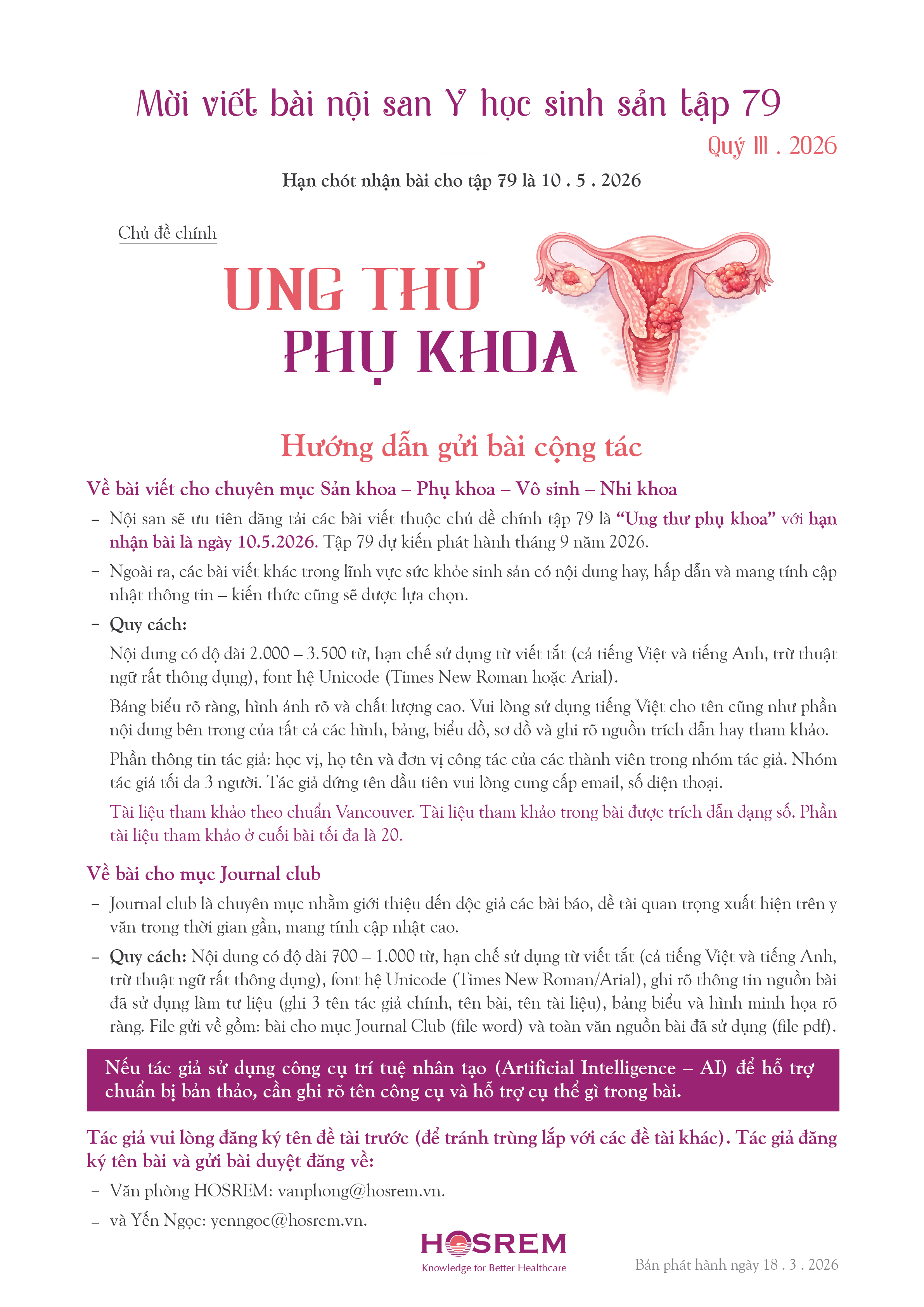 Mời viết bài Y học sinh sản 79 | Chủ đề chính "Ung thư phụ khoa"