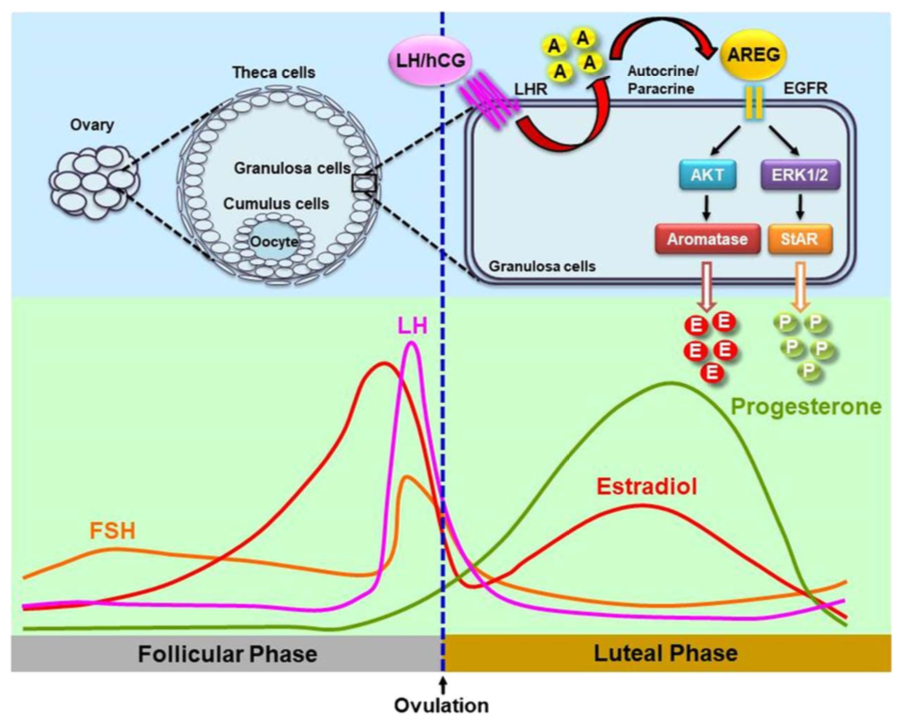 Ở phụ nữ, estrogen có vai trò quan trọng trong hệ sinh sản. Estrogen điều hoà quá trình sản xuất steroid, phát triển nang noãn, phóng noãn và chức năng hoàng thể. Bước cuối cùng trong quá trình sinh tổng hợp estrogen từ androgen được xúc tác bởi men thơm hoá (aromatase) được mã hóa bởi họ cytochrome P450 và được biểu hiện bởi các tế bào hạt của nang noãn giai đoạn trước phóng noãn với nồng độ được thể hiện rõ rệt trong pha hoàng thể. Đến nay, chỉ có một số yếu tố điều hòa sản xuất estradiol buồng trứng (E2) và aromatase được đề cập. Trong đó, gonadotropin FSH tuyến yên là yếu tố được biết đến nhiều nhất có vai trò cảm ứng biểu hiện aromatase ở tế bào hạt. Tuy nhiên, trong giai đoạn hoàng thể, nồng độ FSH giảm mạnh sau đỉnh LH và nồng độ E2 vẫn được duy trì, điều này cho thấy vẫn còn một cơ chế điều hòa sản xuất E2 không phụ thuộc vào FSH. Gần đây, các thụ thể Epidermal growth factor (EGFR; hay HER1/ErbB1) được các nhà nghiên cứu quan tâm bởi tác động điều hoà các chức năng sinh lý và bệnh lý ở hệ sinh sản của phụ nữ. EGFR và các liên kết của nó gồm: Amphiregulin (AREG), betacellulin (BTC) và epiregulin (EREG) được kích thích bởi hCG người, trong đó AREG được tiết bởi tế bào hạt có nồng độ trong dịch nang có thể lên đến 100ng/ml sau khi sử dụng hCG, sự tương tác giữa EGFR và liên kết của nó AREG có thể là một cơ chế điều hòa aromatase và E2 ở giai đoạn hoàng thể, tuy nhiên trước nghiên cứu này, vẫn chưa có công bố nào đánh giá về cơ chế tác động này, bài nghiên cứu được thực hiện nhằm làm rõ hơn sự tiết E2 ở pha hoàng thể dựa vào cơ chế tác động của AREG dưới sự cảm ứng của hCG/LH.