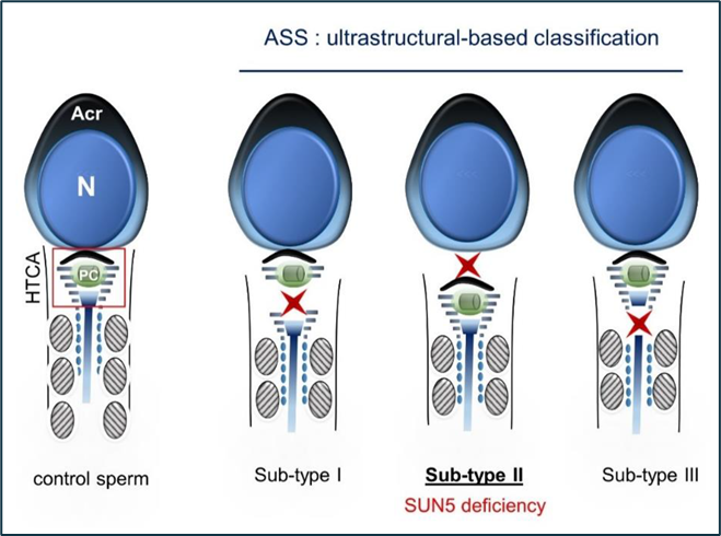 Tinh trùng AS được chia thành 3 phân nhóm dựa vào cấu trúc siêu vi tại vị trí HTCA, bao gồm [sub-type I] bất thường cấu trúc giữa trung tử xa (DC) và trung tử gần (PC), [sub-type II] bất thường cấu trúc giữa nhân và trung tử gần (PC), liên quan đến đột biến các gene SUN5, HOOK1, PMFBP1và [sub-type III] bất thường cấu trúc giữa trung tử xa (DC) và vỏ ty thể, liên quan đến đột biến các gene TSGA10, BRDT (Hình 1).