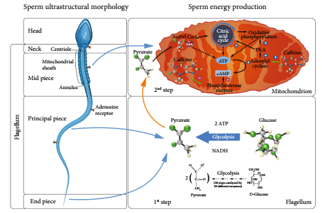 Hình: Cấu tạo tinh trùng và cơ chế sản xuất năng lượng trong tế bào chất và ty thể của tinh trùng