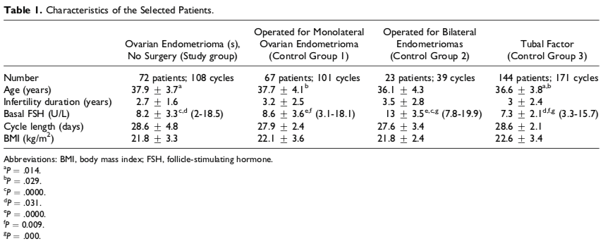 Những bệnh nhân vô sinh do nguyên nhân vòi trứng trẻ hơn những bệnh nhân bị u lạc nội mạc tử cung buồng trứng đã hay chưa từng phẫu thuật. FSH nền của những bệnh nhân vô sinh nguyên nhân vòi trứng cũng thấp hơn hẳn so với các nhóm khác.