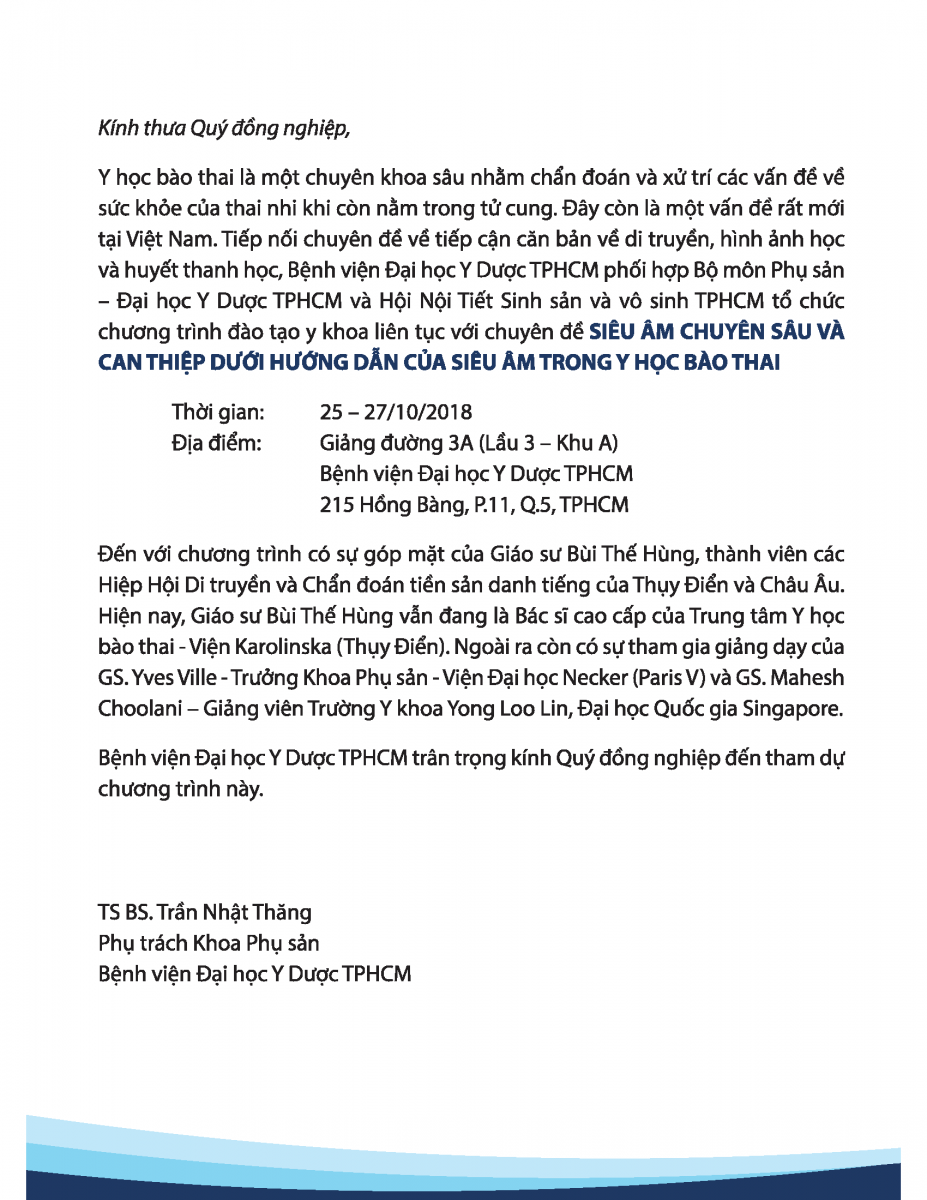 Chương trình đào tạo y khoa liên tục chuyên đề SIÊU ÂM CHUYÊN SÂU VÀ CAN THIỆP DƯỚI HƯỚNG DẪN CỦA SIÊU ÂM TRONG Y HỌC BÀO THAI 25/10/2018 55 Lượt xem Ngày 25-27/10/2018, Giảng đường 3A (Lầu 3 – Khu A) Bệnh viện Đại học Y Dược TPHCM, Số 215 Hồng Bàng, P.11, Q.5, TPHCM Chia sẻ bài viết: Zalo