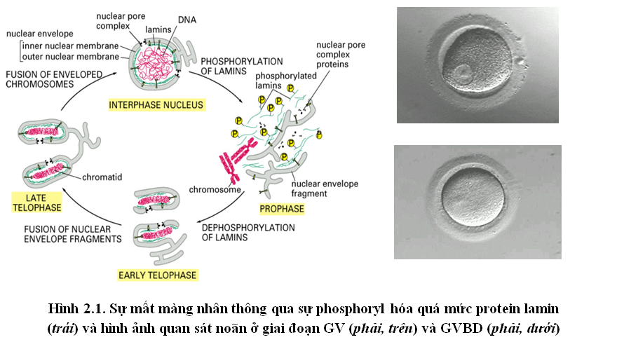 Sự tiếp tục quá trình giảm phân của noãn được khởi phát để đáp ứng với tác dụng của hormone LH (Luteinizing hormone) ở tuổi dậy thì khi noãn bắt đầu tích tụ dịch nang. Noãn lúc này sẽ nhận hormone progesterone từ các tế bào cumulus qua các thụ thể của hormone này gắn trên màng sinh chất của noãn. Khi các hormone đã hoàn toàn tiếp xúc với thụ thể, cytoplasmic domain của thụ thể khởi phát một tín hiệu phân tử nội bào làm hạn chế sự tổng hợp cAMP nội sinh [1]. Ngoài ra, một nghiên cứu đã cho thấy sự tiếp tục quá trình giảm phân của noãn còn được điều hỏa bởi sự ngừng tương tác giữa noãn và các tế bào granulosa [4]. Trong nghiên cứu này, người ta tách noãn ra khỏi các tế bào granulosa và nhận thấy các noãn này thoát khỏi sự bắt giữ chu trình tế bào tại Prophase I và tiếp tục giảm phân. Như chúng ta đã biết, noãn và các tế bào này tương tác với nhau bằng tương tác gap junction (cầu nối liên bào) và các tế bào cumulus liên tục cung cấp cAMP cho noãn. Chính vì thế, khi các tương tác này giảm đi, lượng cAMP cung cấp cho noãn cũng giảm đi đáng kể. Kết quả của cả hai hiện tượng trên làm giảm nồng độ cAMP nội bào. Nồng độ cao cAMP nội bào dẫn đến kích hoạt yếu tố ức chế phiên mã PKAR/c, yếu tố này kiểm soát không cho noãn phiên mã các protein cần thiết để tiếp tục chu trình tế bào, chính vì thế ở giai đoạn GV chu trình tế bào của noãn bị bắt giữ ở prophase I. Khi nồng độ cAMP giảm, yếu tố ức chế phiên mã PKAR/c bị bất hoạt, noãn tiếp tục phiên mã dịch mã các protein đặc trưng, trong đó, 2 protein CyclinA và Cdk2 tham gia hình thành phức hợp protein CyclinB/Cdc2 đồng thời phosphoryl hóa phức hợp này (do bản chất của Cdk2 là một kinase protein). Sau khi được phosphoryl hóa, CyclinB/Cdc2 hoạt động như một kinase protein, làm phá vỡ túi mầm (GVBD).Sở dĩ CyclinB/Cdc2 có thể làm tan túi mầm (màng nhân noãn) là vì màng nhân của noãn cấu tạo chủ yếu bởi các protein lamin kết hợp với nhau (một nghiên cứu sử dụng các kháng thể kháng các lamin này đã xác định được màng nhân noãn được cấu tạo bởi 2 loại protein – lamin B và lamin AC) [3], [6]. Nhưng khi sự phosphoryl hóa quá mức, các lamin rời nhau ra, màng nhân tan biến. Dưới kính hiển vi quang học, ta có thể nhận biết GVBD qua hiện tượng mất màng nhân noãn (hình 2.1).