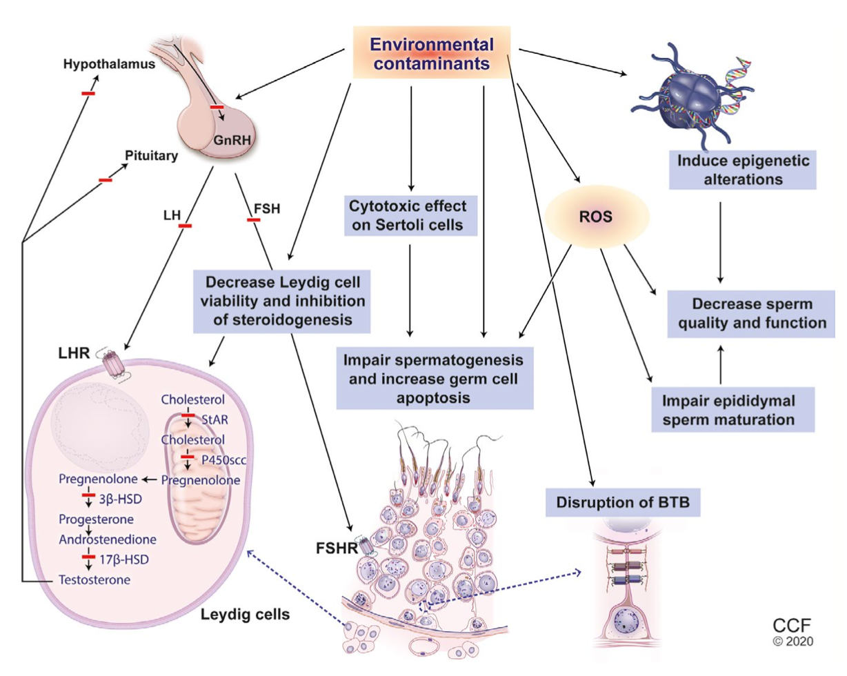 Tỷ lệ leo thang của vô sinh nam và xu hướng giảm chất lượng tinh trùng có liên quan đến quá trình công nghiệp hóa nhanh chóng và sự thải ra một lượng dư thừa các chất tổng hợp vào môi trường. Việc tiếp xúc với các chất gây ô nhiễm môi trường phân bố khắp nơi có khả năng can thiệp vào sự phát triển và chức năng của cơ quan sinh sản nam.