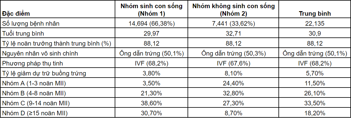 Bệnh nhân được chia thành bốn nhóm theo số lượng noãn MII thu được (nhóm A-D). Nhóm bệnh nhân có nhiều noãn trưởng thành hơn có tuổi trẻ hơn và có CLBR cao hơn. Điều thú vị là tỷ lệ noãn trưởng thành, tỷ lệ thụ tinh và tỷ lệ phôi nang cũng tăng lên với số lượng noãn MII, từ đó có nhiều phôi khả dụng hơn (p < 0,001). Tuy nhiên, không có sự khác biệt đáng kể về tỷ lệ phôi phân chia (p = 0,994). Kết quả trên cho thấy những bệnh nhân có số lượng noãn MII cao thì chất lượng noãn cũng tốt hơn. Trong đó, fLBR cao hơn đáng kể ở Nhóm C (9–14) so với ba nhóm A, B, D (p < 0,001).