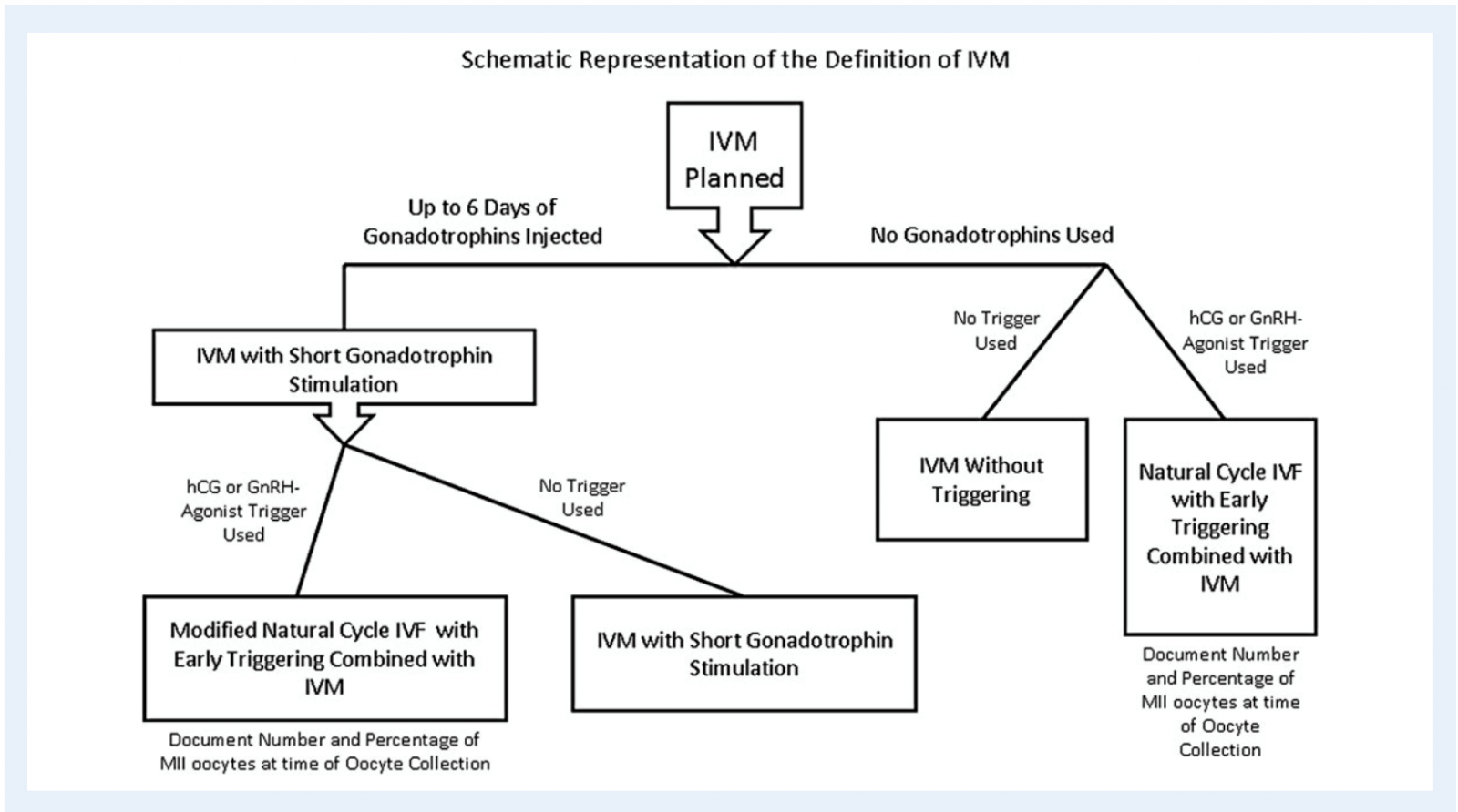 Vì hiện nay có khá nhiều phác đồ IVM lâm sàng khác nhau, do đó nhóm tác giả khuyến nghị đặt tên cho từng chu kỳ IVM trong những trường hợp tương ứng như sau: IVF chu kỳ tự nhiên với kích hoạt trưởng thành noãn sớm kết hợp với IVM (trong trường hợp không sử dụng mồi FSH, chỉ sử dụng mồi hCG/GnRHa), hoặc IVF chu kì tự nhiên biến đổi với kích hoạt trưởng thành noãn sớm kết hợp với IVM (trong trường hợp có sử dụng mồi FSH và mồi hCG/GnRHa).