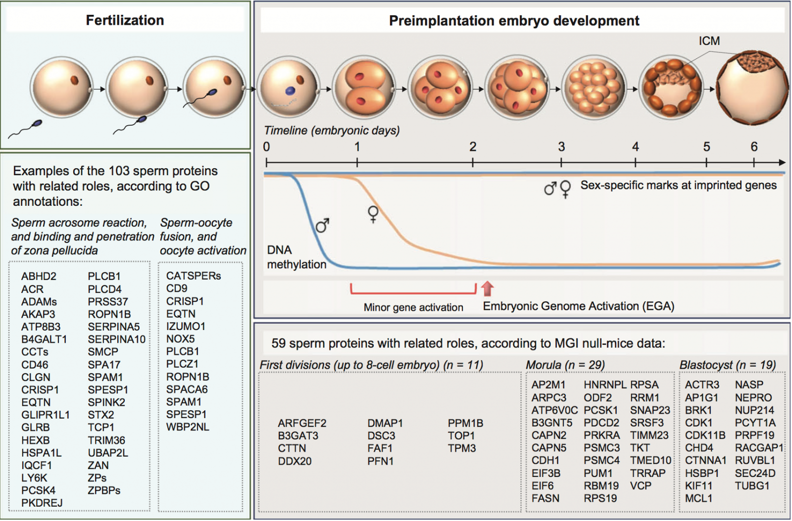 Các phân tích hệ protein tinh trùng người đã xác định 93 protein có thể liên quan đến các chức năng hình thành giao tử và sự phát triển phôi ở các giai đoạn sau đó trước khi quá trình làm tổ xảy ra (khoảng ngày 7 ở người). Các nghiên cứu knockout gene trên mô hình chuột cũng chỉ ra 59 protein khác nhau có ảnh hưởng đáng kể đến các giai đoạn khác nhau trong sự phát triển của phôi tiền làm tổ, trong đó 11 protein tham gia vào sự phát triển của hợp tử sau thụ tinh đến giai đoạn phôi 8 tế bào; 29 protein đóng góp vào sự phát triển của phôi trong giai đoạn phôi dâu và 19 protein khác có vai trò khá quan trọng trong sự hình thành và phát triển phôi nang. Cụ thể hơn, nhóm 11 protein trong đóng góp vào sự phát triển của hợp tử đến giai đoạn phôi 8 tế bào chủ yếu liên quan đến ức chế các hoạt động gây chết hợp tử và phôi bào. Đơn cử một ví dụ là protein Desmocllin (DSC3), DSC3 ảnh hưởng quan trọng đến sự phát triển chính xác của phôi thông qua điều hoà các hoạt động gắn kết giữa các tế bào – là một trong những sự kiện quan trọng quyết định sự hình thành nên các phôi bào diễn ra từ ngày 1 của sự phát triển phôi người. Tương tự, protein lactosylceramide 1,3-N-acetyl-beta-D-glucosaminylnyltransferase (B3GNT5) và Choline-phosphate cytidylyltransferase (PCYT1A) lần lượt đại diện cho hai nhóm protein có nguồn gốc từ tinh trùng góp phần vào sự phát triển của phôi ở giai đoạn phôi dâu và phôi nang. B3GNT5 xúc tác sự sinh tổng hợp các chuỗi lactose của phân tử glysophingolipid và sự vắng mặt protein này sẽ dẫn đến sự thoái hoá của phôi ở giai đoạn phôi dâu thông qua việc thay đổi các quá trình gắn kết tế bào và con đường tín hiệu tế bào. Ngược lại, protein PCYT1A liên quan đến tín hiệu khởi phát sự tổng hợp phosphatidylcholine – phân tử phospholipid dồi dào nhất cấu tạo nên màng tế bào. Nghiên cứu trên mô hình chuột cho thấy với sự vắng mặt PCYT1A sẽ dẫn đến sự thất bại trong việc hình thành phôi nang có khả năng làm tổ.