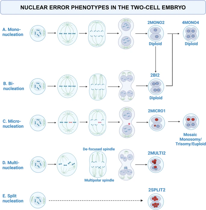 Chú thích: Ở giai đoạn hai tế bào, phôi phải có một nhân (mono - nucleation) trên mỗi tế bào, được gọi là đơn nhân (A). Phôi đơn nhân được cho là lưỡng bội và tạo ra phôi bốn tế bào lưỡng bội. Phôi hai nhân (Bi - nucleation) (B) có hai nhân có kích thước bằng nhau trong tế bào. Một cơ chế đằng sau các tế bào hai nhân ở giai đoạn hai tế bào là sự thất bại trong việc sắp xếp các thoi phân bào khi hợp tử chuyển sang phôi giai đoạn phân chia. Điều này dẫn đến phôi hai tế bào lưỡng bội nhưng có hai nhân trên mỗi tế bào bị ảnh hưởng, và sau lần phân bào thứ hai, kết quả là phôi bốn tế bào lưỡng bội. Sự phân chia nhân trước khi phân chia tế bào cũng có thể dẫn đến hai nhân. Vi nhân (Micro- nucleation) (C) là sự hiện diện của một nhân phụ có kích thước nhỏ hơn bên cạnh nhân bình thường. Chúng chứa NST và thường liên quan đến lệch bội toàn bộ NST hoặc lệch bội từng đoạn. Phôi tạo thành là thể khảm, chứa các tế bào có đơn bội, tam bội hoặc di truyền bình thường. Đa nhân (Multi - nucleation) (D) là sự hiện diện của ba hoặc nhiều nhân riêng lẻ trong một tế bào. Chúng là kết quả của các thoi phân bào lưỡng cực bị mất tiêu điểm, hoặc thoi phân bào ba cực phân tách NST thành nhiều nhân. Nhân phân mảnh (Split - nucleation) (E) là kiểu nhân bị phân mảnh nghiêm trọng. Cơ chế phân mảnh trong phôi chưa được biết đến. Các cơ chế được đề xuất trong Hình 1 sẽ được phân tích chi tiết hơn ở phần tiếp theo.