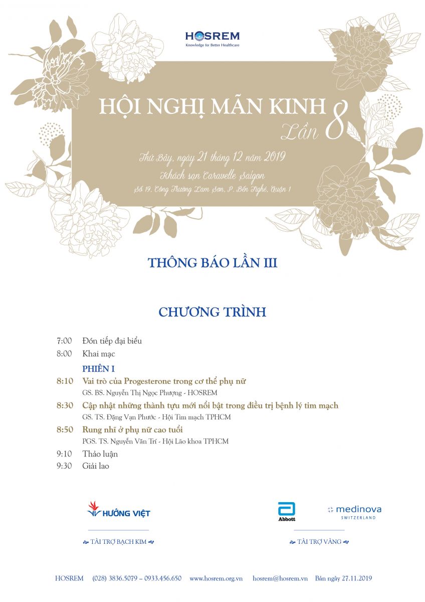 HỘI NGHỊ MÃN KINH LẦN 8 27/11/2019 15 Lượt xem Thứ Bảy, ngày 21 tháng 12 năm 2019 Khách sạn Caravelle Saigon (Số 19, Công Trường Lam Sơn, P. Bến Nghé, Quận 1) Từ khóa: HỘI NGHỊ MÃN KINH Chia sẻ bài viết: Zalo