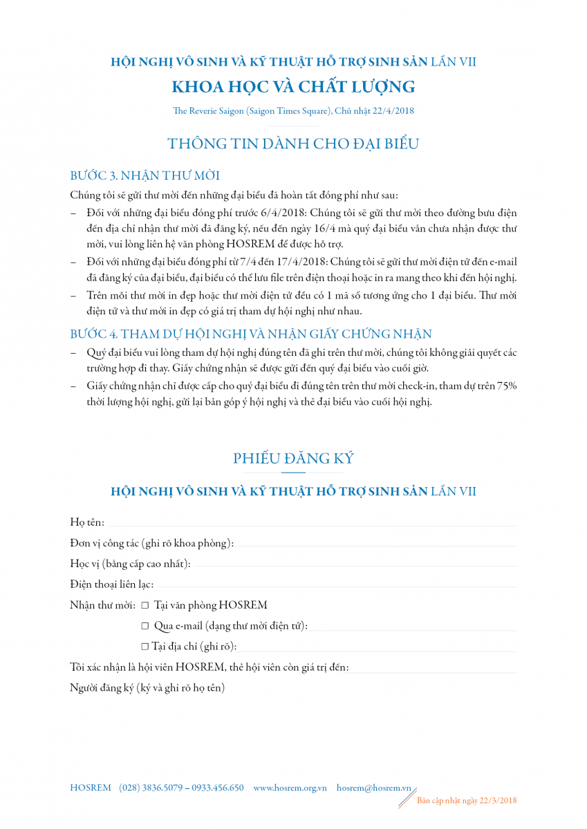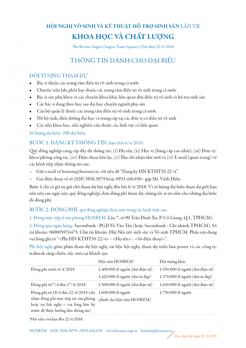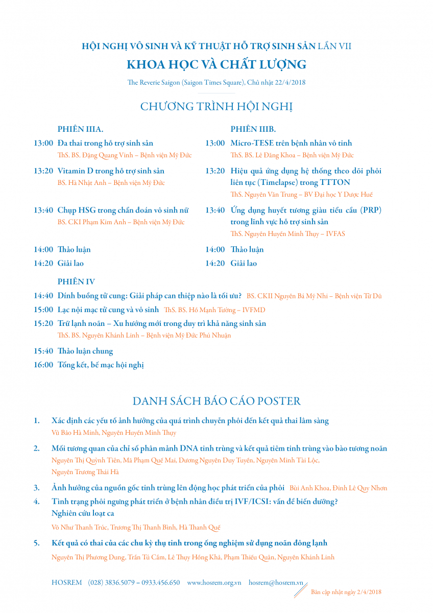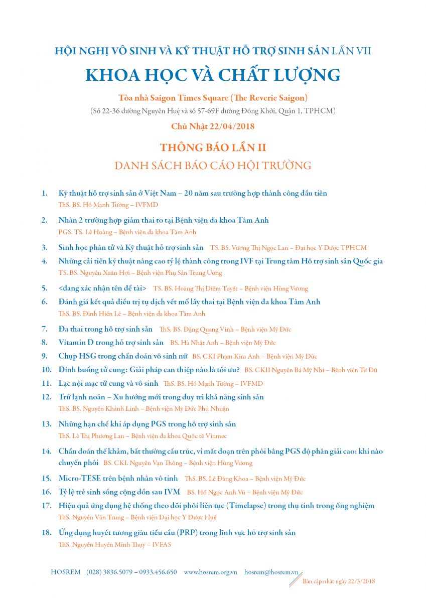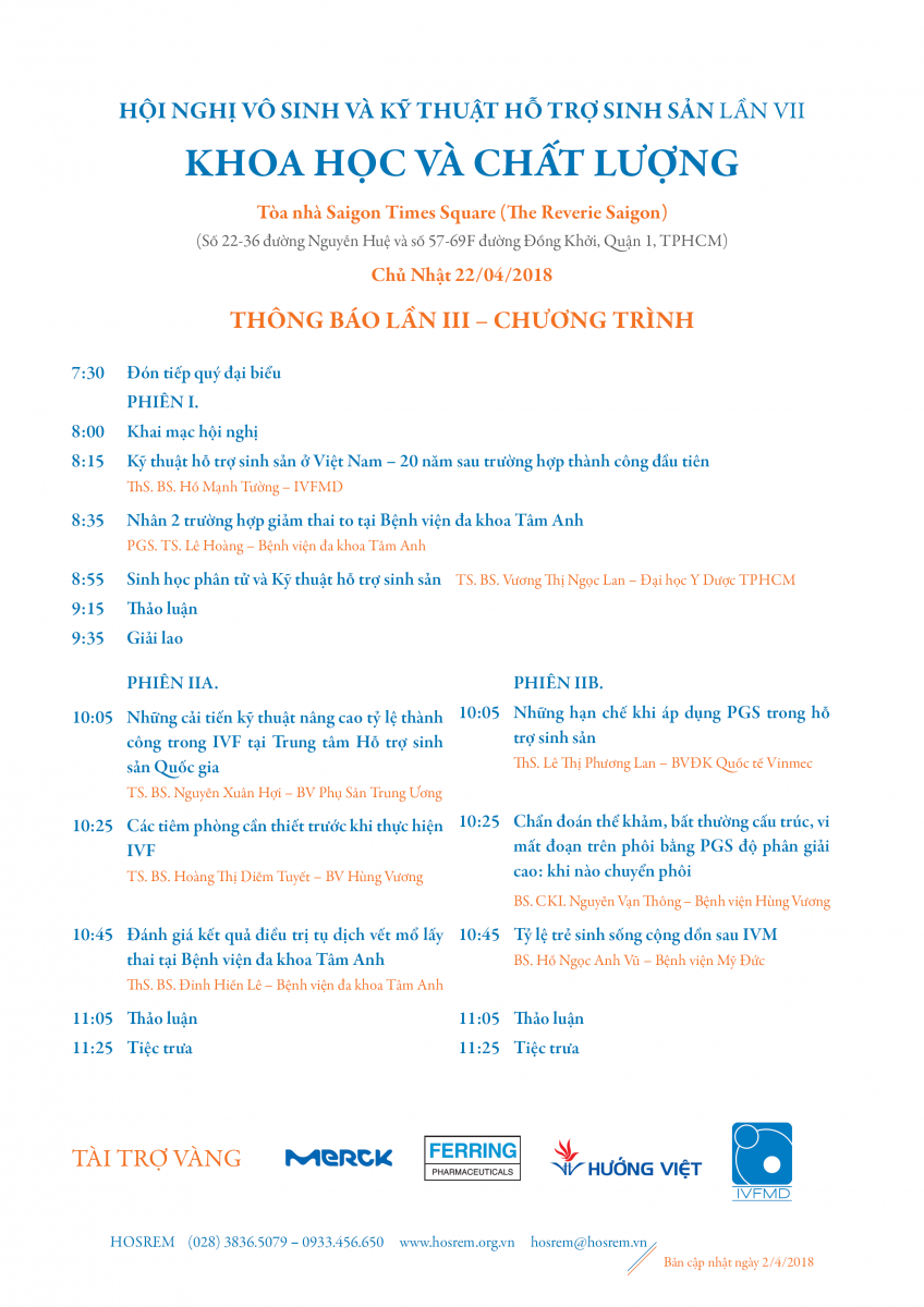 Hội nghị Vô sinh và Kỹ thuật hỗ trợ sinh sản lần VII: "Khoa học và Chất lượng" sẽ diễn ra trong vòng 3 ngày liên tục (từ Thứ Sáu 20/4 đến Chủ nhật 22/4), gồm tổ hợp 3 sự kiện quan trọng trong lĩnh vực hỗ trợ sinh sản đã được tổ chức thường xuyên trong nhiều năm qua