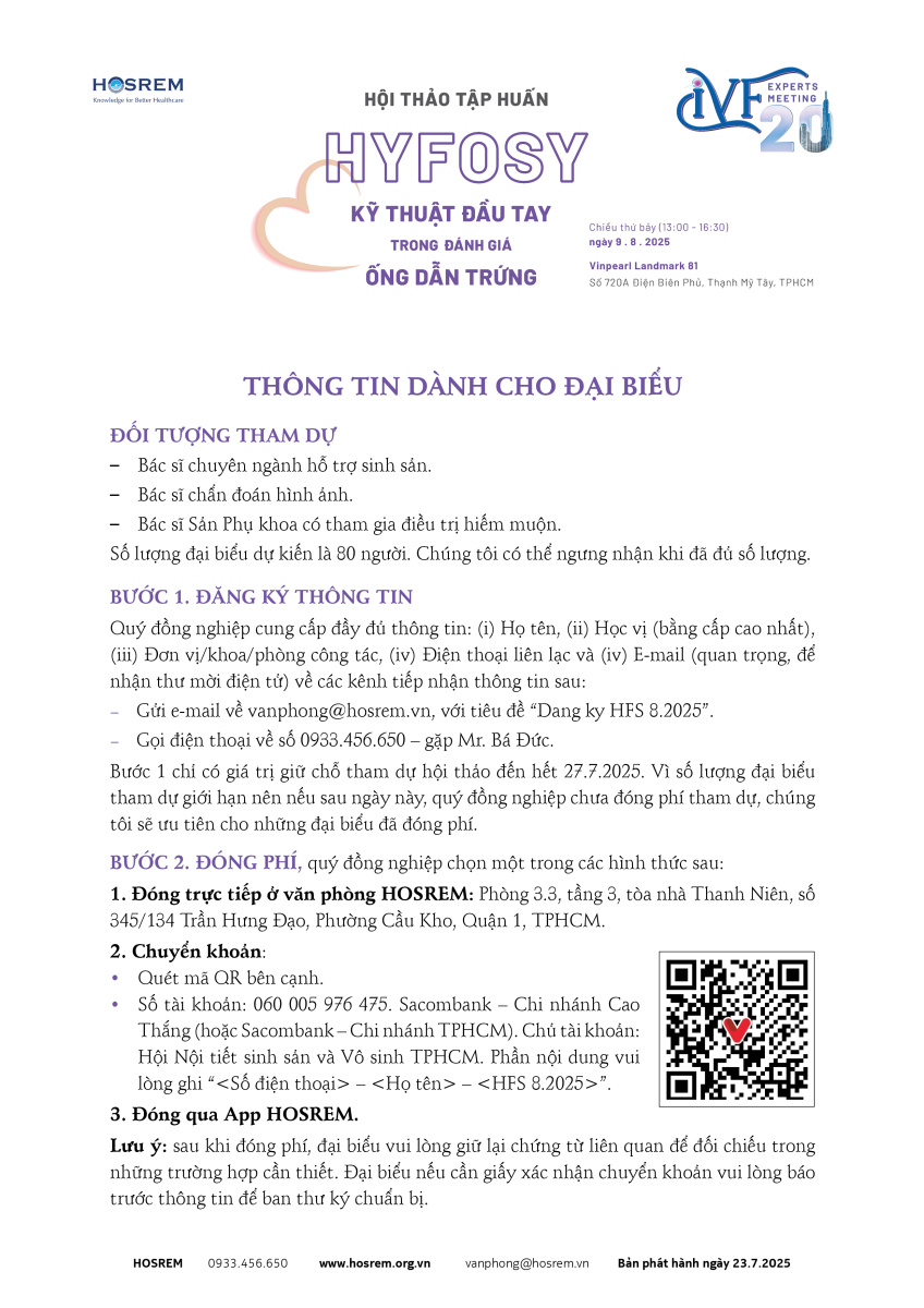 Hội thảo tập huấn HyFoSy - Kỹ thuật đầu tay trong đánh giá ống dẫn trứng 23/07/2025 40 Lượt xem Vinpearl Landmark 81, chiều thứ bảy 9 . 8 . 2025 (13:00 - 16:30) PRECONGRESS IVF EXPERTS MEETING LẦN THỨ 20 HỘI THẢO TẬP HUẤN HYFOSY - KỸ THUẬT ĐẦU TAY TRONG ĐÁNH GIÁ ỐNG DẪN TRỨNG Vinpearl Landmark 81 Chiều thứ bảy 9 . 8 . 2025 (13:00 - 16:30) Từ khóa: HyFoSyống dẫn trứng Chia sẻ bài viết: Zalo