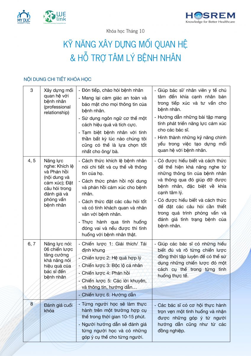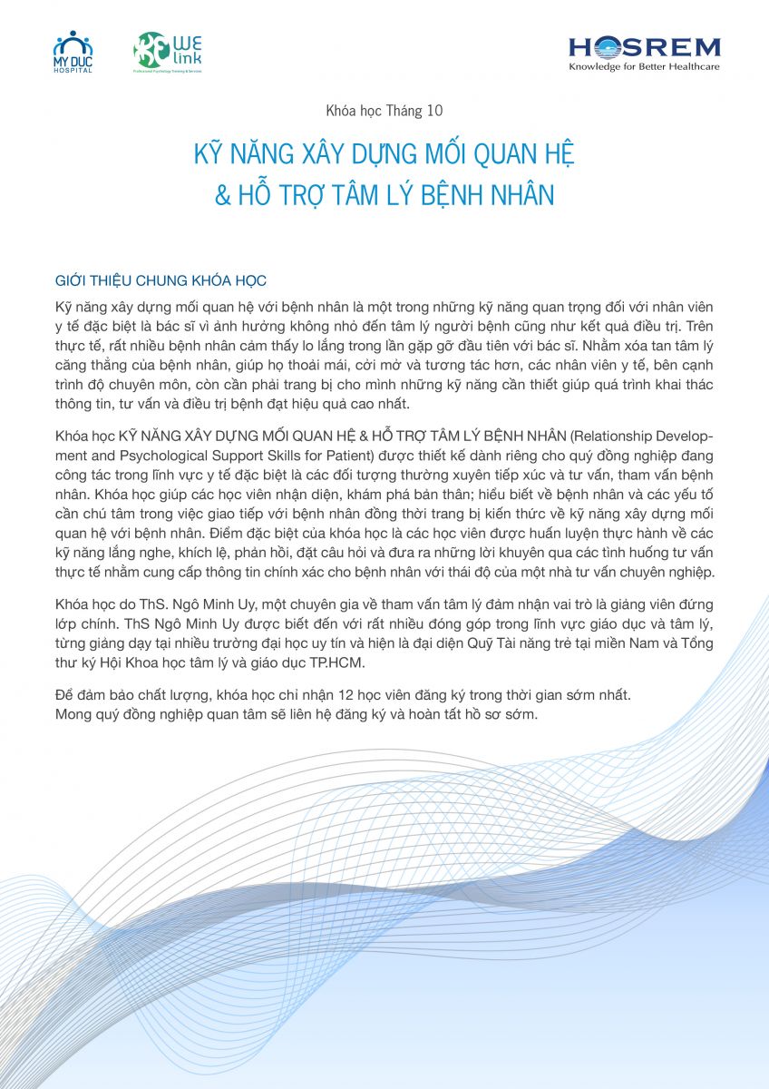 Khóa học "Kỹ năng xây dựng mối quan hệ & hỗ trợ tâm lý bệnh nhân" 16/09/2017 59 Lượt xem Khóa học "Kỹ năng xây dựng mối quan hệ & hỗ trợ tâm lý bệnh nhân" Từ khóa: Khóa học "Kỹ năng xây dựng mối quan hệ & hỗ trợ tâm lý bệnh nhân" Chia sẻ bài viết: Zalo
