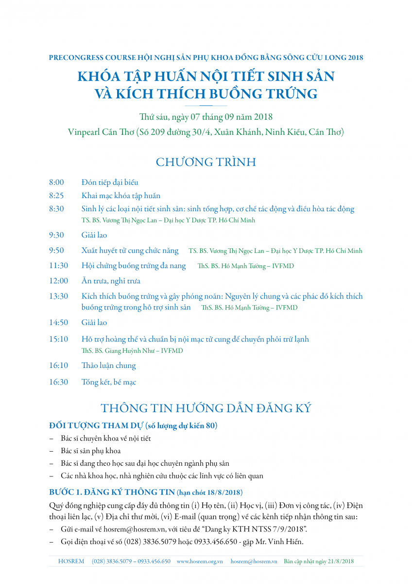 Khóa tập huấn "Nội tiết sinh sản và kích thích buồng trứng" 21/08/2018 28 Lượt xem Vinpearl Cần Thơ (Số 209 đường 30/4, Xuân Khánh, Ninh Kiều, Cần Thơ) Từ khóa: Khóa tập huấn "Nội tiết sinh sản và kích thích buồng trứng" Chia sẻ bài viết: Zalo