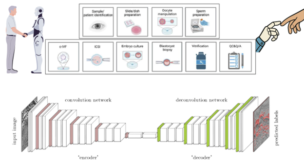 Trí tuệ nhân tạo có thể có cơ hội tham gia chủ yếu vào các công đoạn có tính lặp lại và có thể chuẩn hóa cao trong quy trình TTTON (3). Trong các trường hợp này, việc áp dụng các giải pháp tự động hóa là hoàn toàn khả thi, với kỳ vọng mang lại độ chính xác, khả năng tái lập và tốc độ vượt trội so với thao tác thủ công. Thực tế, nhiều công việc trước đây do con người thực hiện đã được thay thế bằng thiết bị tự động. Ngày nay, dụng cụ vi thao tác và môi trường nuôi cấy đều được sản xuất hoàn toàn bằng máy móc tự động, trong khi trước đây kim ICSI và dung dịch bảo quản lạnh từng được chuẩn bị thủ công bởi các chuyên viên phôi học.