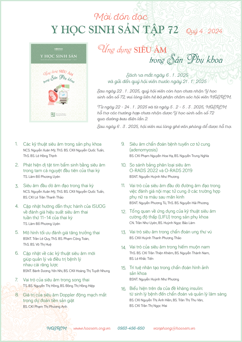Mời đón đọc Y học sinh sản số 72 - Ứng dụng siêu âm trong sản phụ khoa 15/01/2025 170 Lượt xem Sách ra mắt ngày 6 . 1 . 2025 và gửi đến quý hội viên trước ngày 21 . 1 . 2025 Mời đón đọc Y học sinh sản số 72 Sách ra mắt ngày 6 . 1 . 2025 và gửi đến quý hội viên trước ngày 21 . 1 . 2025 Từ khóa: y học sinh sảnsiêu âmsản phụ khoa Chia sẻ bài viết: Zalo