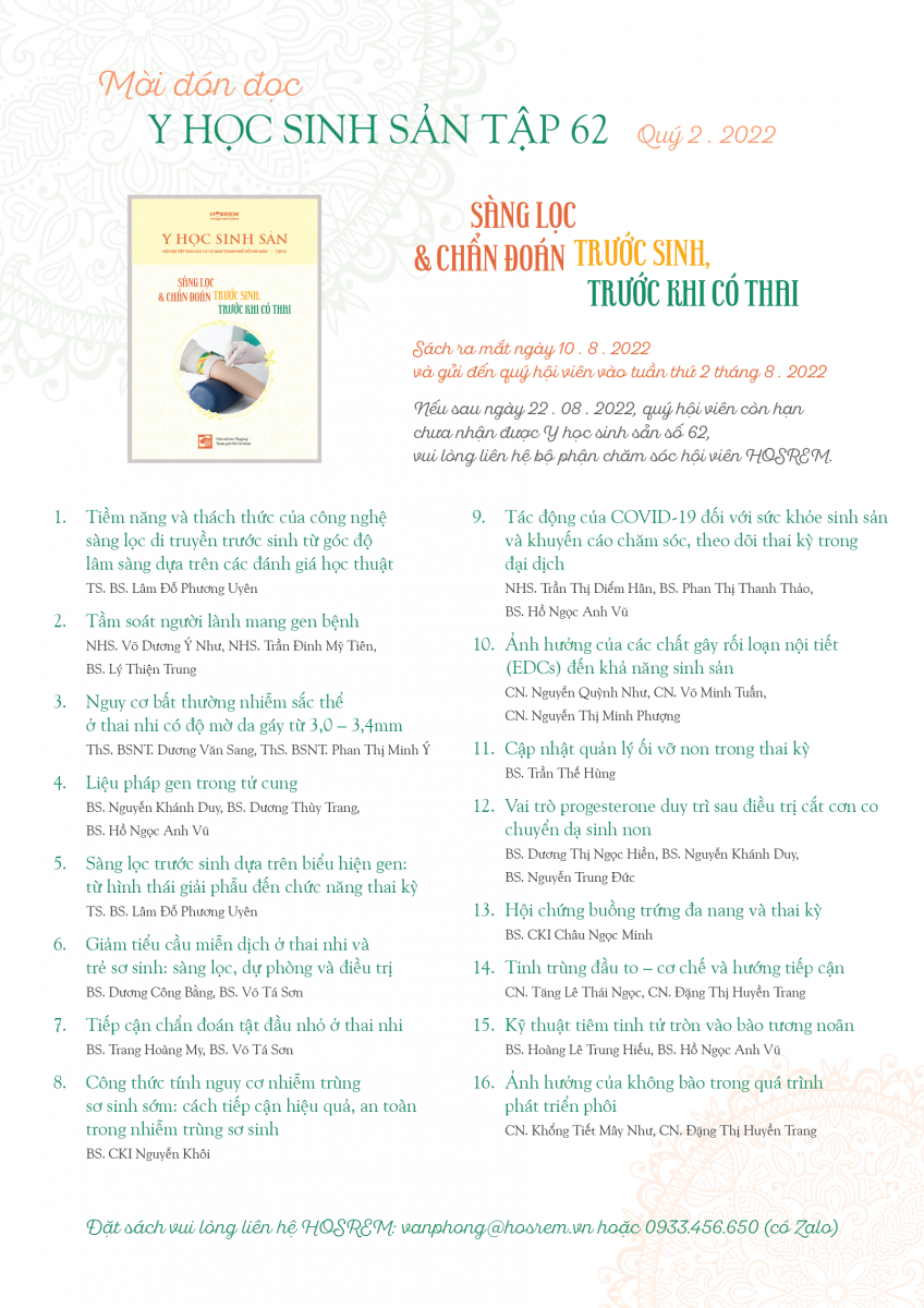 Mời đón đọc Y học sinh sản tập 62 (quý 2 . 2022) 10/08/2022 58 Lượt xem Y học sinh sản tập 62 ra mắt ngày 10 . 8 . 2022 Kính gửi quý hội viên, Mời đón đọc Y học sinh sản tập 62 Chủ đề chính "Sàng lọc & chẩn đoán trước sinh, trước khi có thai" Từ khóa: Y học sinh sảntập 62 Chia sẻ bài viết: Zalo