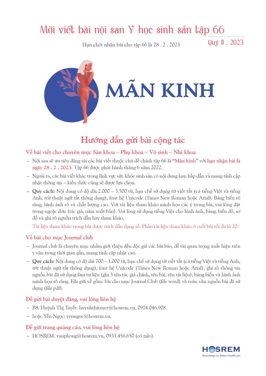 Mời viết bài Y học sinh sản 66 - Mãn kinh 23/11/2022 91 Lượt xem Mời gửi bài cho tập 66 trước 28 . 02 . 2023. Kính gửi quý đồng nghiệp, Kính mời quý đồng nghiệp tham gia viết bài cho nội san Y học sinh sản tập 66, chủ đề "Mãn kinh". Quý đồng nghiệp vui lòng gửi bài cho tập 66 trước 28 . 02 . 2023. Từ khóa: Mãn kinh Chia sẻ bài viết: Zalo