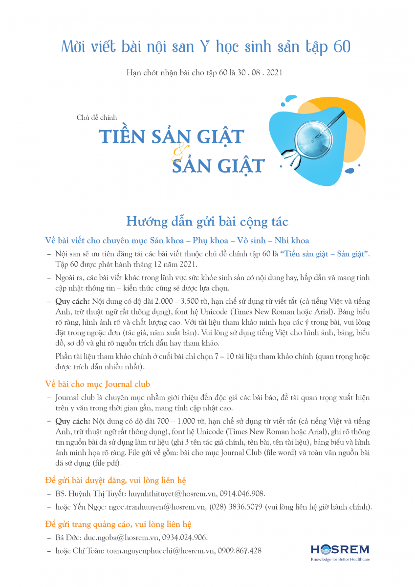 Mời quý đồng nghiệp tham gia viết bài cho Y học sinh sản số 60 với chủ đề "Tiền sản giật và Sản giật"