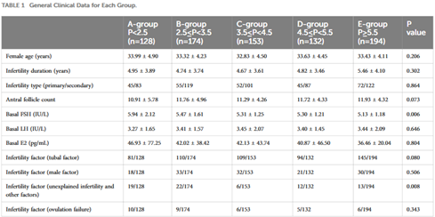 Có sự khác biệt đáng kể về FSH nền và yếu tố vô sinh (vô sinh không rõ nguyên nhân và các yếu tố khác) giữa các nhóm, nhưng không có sự khác biệt có ý nghĩa thống kê về tuổi tác, thời gian vô sinh, loại vô sinh, LH nền, estradiol cơ bản (E2) và các yếu tố gây vô sinh (yếu tố ống dẫn trứng, yếu tố nam giới và rối loạn rụng trứng) (bảng 1).