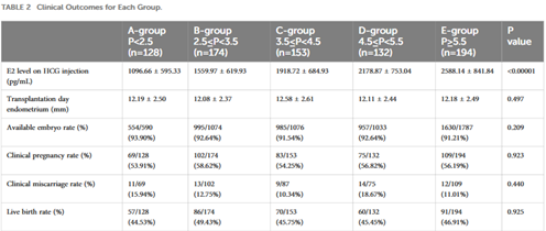 Mặc dù xác định được sự khác biệt đáng kể về estradiol khi tiêm HCG, nhưng không có sự khác biệt về nội mạc tử cung vào ngày chuyển phôi, tỷ lệ phôi có sẵn, tỷ lệ mang thai lâm sàng, tỷ lệ sẩy thai hoặc tỷ lệ sinh sống (Bảng 2).