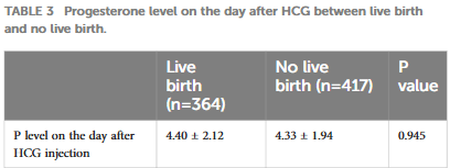 Phân tích kết quả nghiên cứu cho thấy không có sự khác biệt đáng kể về mức progesterone vào ngày sau khi tiêm HCG giữa trẻ sinh sống và không sinh con sống. (Bảng 3)