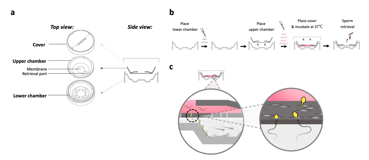 Hình 1: Thiết bị CA0 trong chọn lọc tinh trùng dựa vào độ di động. (a) Thiết bị CA0 gồm 3 phần: buồng dưới, buồng trên với màng lọc polycarbonate và cổng thu nhận mẫu sau lọc. (b) Các bước chọn lọc mẫu tinh trùng: (1) đặt buồng dưới trên bề mặt phẳng, (2) thêm 1ml mẫu tinh dịch vào buồng dưới cho đến khi mẫu tinh dịch đầy buồng, (3) đặt buồng trên lên phía trên buồng dưới, (4) thêm 0,9ml môi trường rửa tinh trùng vào buồng trên, (5) đậy nắp vào thiết bị CA0 và ủ trong 37oC, (6) thu nhận 0,5ml huyền phù tinh trùng ở buồng trên. (c) Những tinh trùng có khả năng di động tiến tới sẽ bơi qua màng lọc và hướng lên buồng trên. Trong khi đó, những tinh trùng bất động, di động tại chỗ hay tế bào khác sẽ được giữ lại ở buồng dưới.