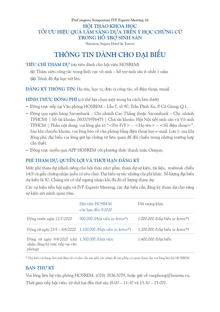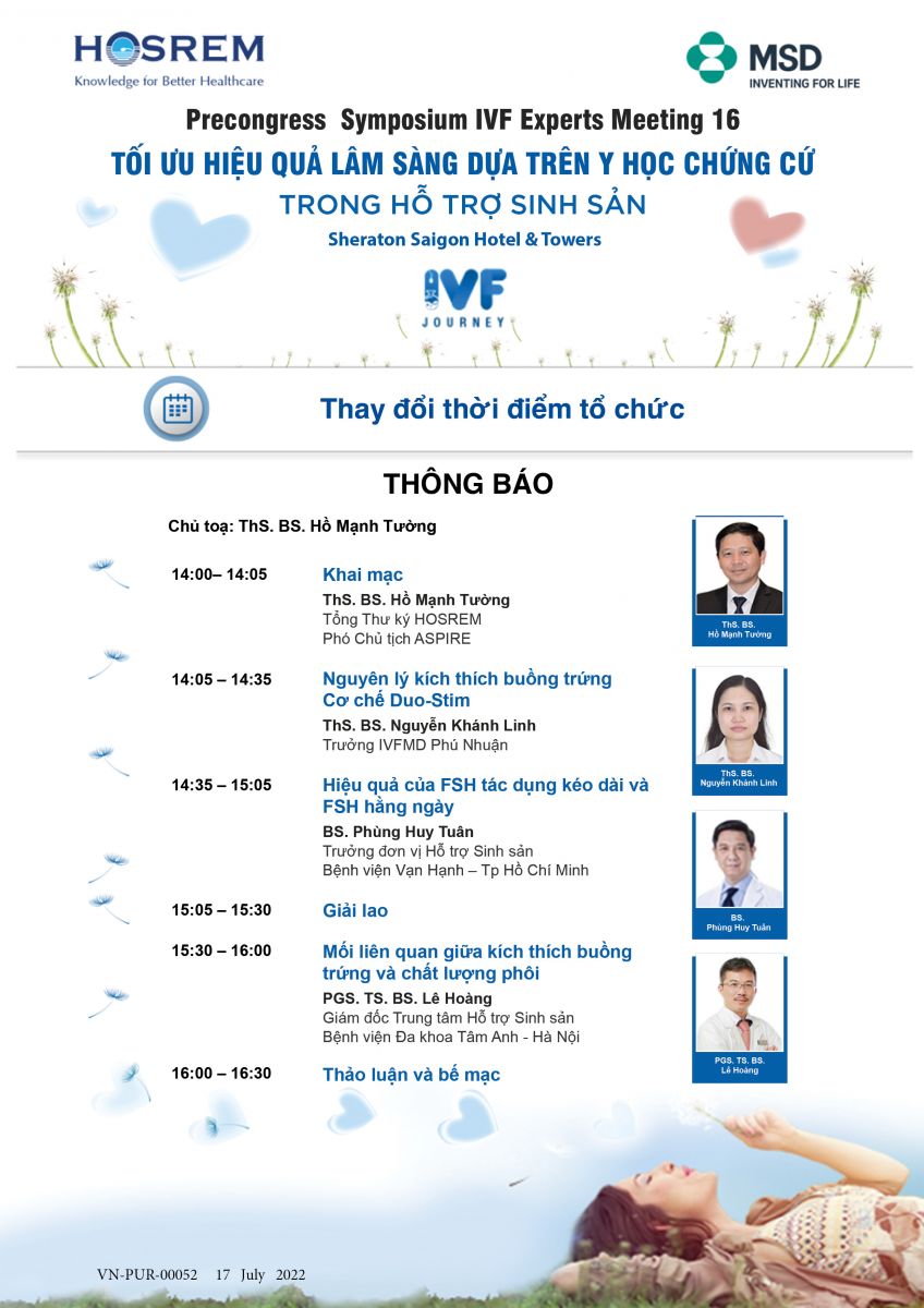 Trước tình hình diễn biến phức tạp của COVID-19 và thực hiện theo tinh thần của công văn số 2869/UBND-VX của Ủy ban Nhân dân TPHCM, HOSREM kính thông tin đến quý báo cáo viên, quý đại biểu và quý công ty tài trợ: IVF Experts Meeting lần 16 dự kiến sẽ dời sang tuần thứ ba đến cuối tháng 9 năm 2020.
