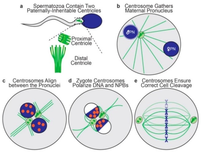 Ngay sau khi tinh trùng và noãn hợp nhất, các trung thể của bố gần nhau và gần với nhân tinh trùng. Chúng tạo thành trung thể đầu tiên của hợp tử bằng cách kéo các protein quanh trung thể từ noãn và phóng ra một sợi vi ống hình sao để kéo tiền nhân của mẹ về phía tiền nhân của bố, dẫn đến sự hình thành hai tiền nhân ở trung tâm. Sau khi nhân đôi, hai trung thể của hợp tử, mỗi trung thể chứa hai trung thể có nguồn gốc từ tinh trùng, xếp thẳng hàng ở mặt phẳng xích đạo chuẩn bị cho quá trình phân bào. Sau đó, hai trung thể liên kết với các cực của thoi phân bào kép, giúp tổ chức và đảm bảo sự phân chia nguyên phân chính xác trong quá trình phân cắt phôi đầu tiên. Các nghiên cứu dịch tễ học đều cho thấy rằng những bất thường của trung thể có thể là nguyên nhân gây ra rối loạn chức năng phôi thai ở người và sinh non [9].