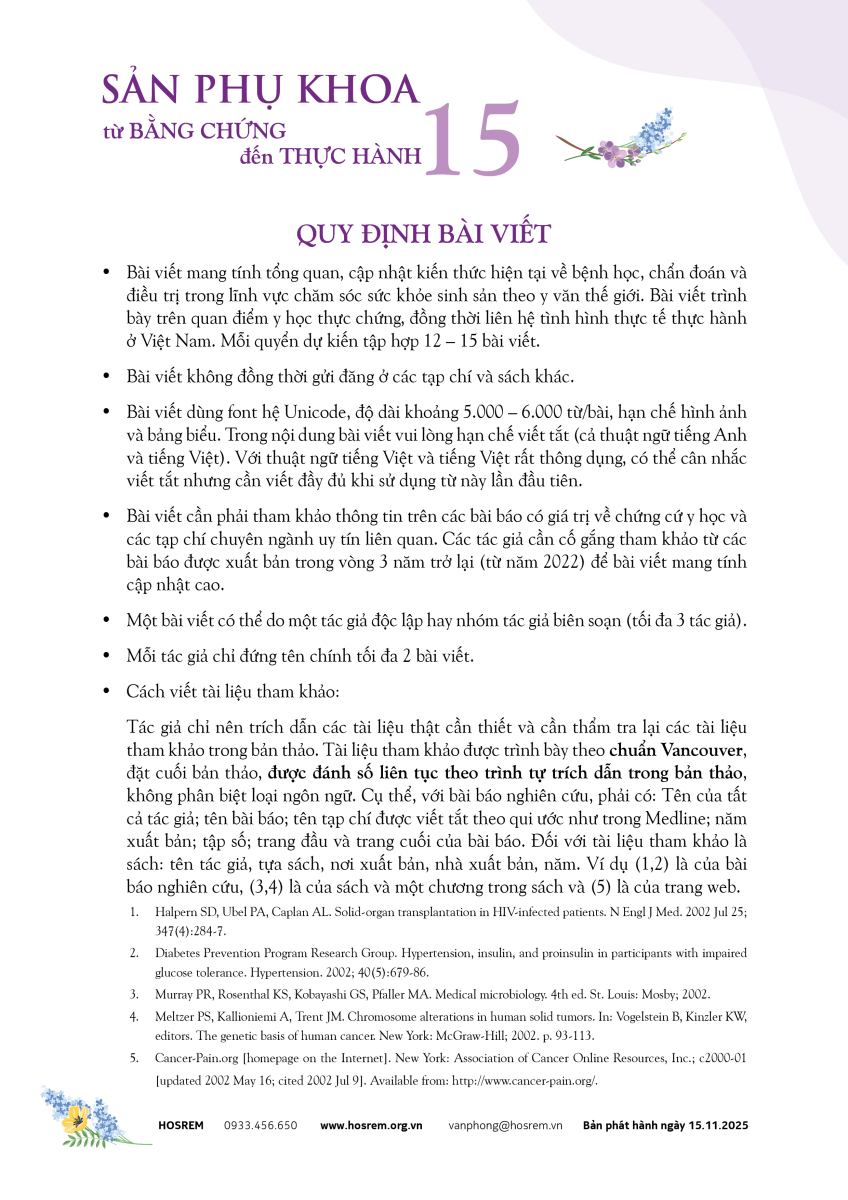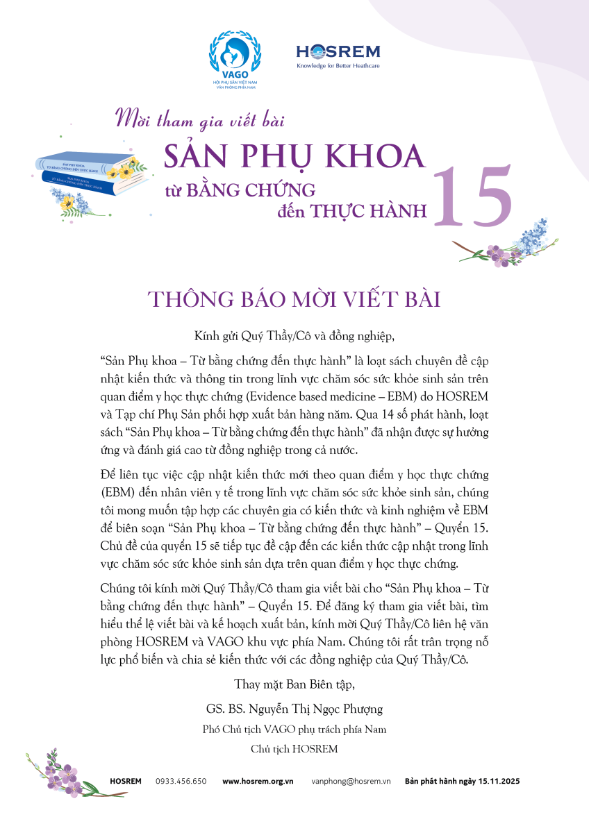 Mời viết bài Sách Sản Phụ khoa - Từ Bằng chứng đến Thực hành - Quyển 15 15/11/2025 233 Lượt xem Kính mời tác giả gửi bài cộng tác trước 30.3.2026 Mời tham gia gửi bài Sách Sản Phụ khoa - Từ bằng chứng đến thực hành - Quyển 15 Kính mời các tác giả gửi bài cộng tác trước 30.3.2026. Từ khóa: EBM 15sản phụ khoabằng chứngthực hành Chia sẻ bài viết: Zalo