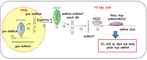 MicroRNA (miRNA) là một họ các phân tử RNA không mã hóa (non-coding RNAs) có chiều dài khoảng 20 nucleotide, đóng vai trò điều hòa (sau phiên mã) sự biểu hiện gen ở tế bào. Quá trình sinh tổng hợp miRNA diễn ra trong nhân và tế bào chất. Ở giai đoạn trong nhân, các gen mã hóa cho miRNA được phiên mã bởi RNA polymerase II tạo thành các phân tử miRNA sơ cấp (pri-miRNA àpre-miRNA). Khi đi vào trong tế bào chất, các pre-miRNA tiếp tục bị phân cắt để tạo thành miRNA dạng mạch đôi, xoắn kép với chiều dài khoảng 20 nucleotide. Sau đó, phân tử miRNA mạch đôi này được tháo xoắn, một trong hai mạch sẽ bị phân hủy nhanh chóng, mạch còn lại chính là miRNA trưởng thành [3].