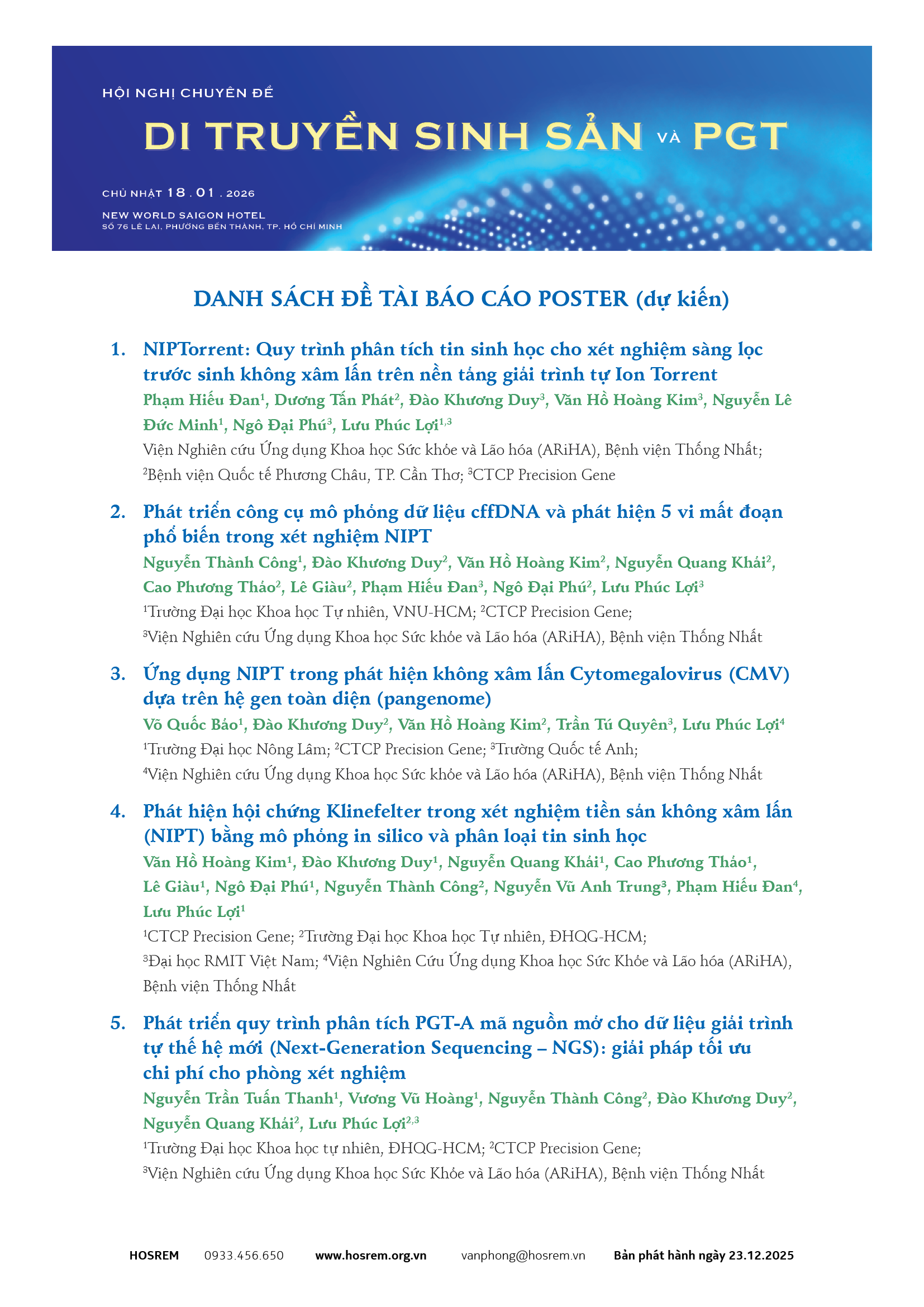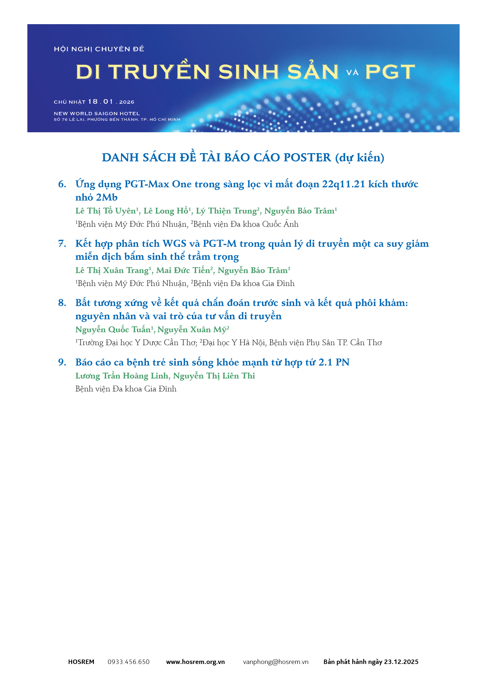 Hội Nội tiết Sinh sản và Vô sinh TP. Hồ Chí Minh (HOSREM) sẽ phối hợp với văn phòng phía Nam của Hội Phụ Sản Việt Nam (VAGO) dự kiến tổ chức Hội nghị chuyên đề “Di truyền sinh sản và PGT” vào Chủ nhật, ngày 18 tháng 01 năm 2026 tại TP. Hồ Chí Minh. Hội nghị Di truyền sinh sản và PGT nhằm mang đến một diễn đàn cập nhật kiến thức về các công nghệ mới và ứng dụng của các xét nghiệm di truyền. Hội nghị cũng sẽ là nơi để đồng nghiệp trao đổi các kinh nghiệm áp dụng lâm sàng, các dữ liệu và nghiên cứu mới trong lãnh vực đang phát triển mạnh mẽ này.