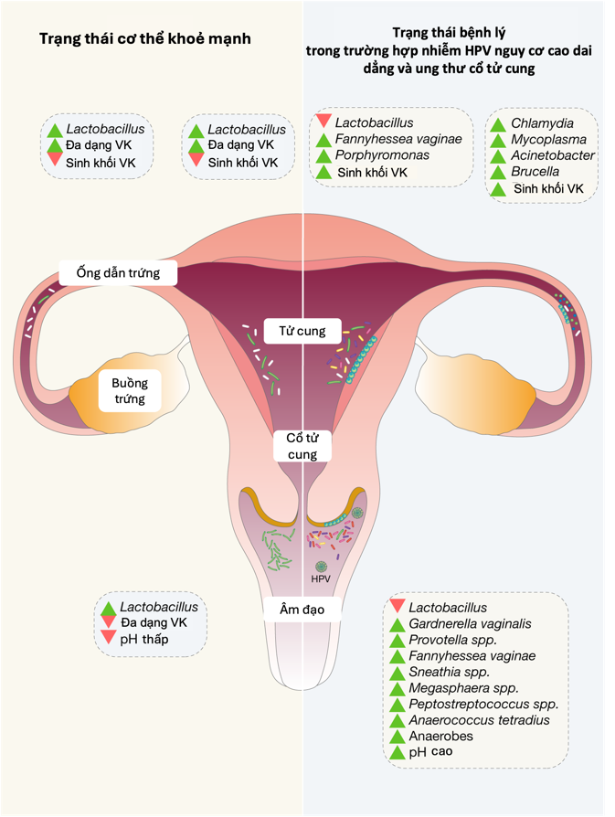 Ung thư cổ tử cung là gánh nặng sức khoẻ lớn ở phụ nữ, chủ yếu do nhiễm dai dẳng virus gây u nhú (Human papillomavirus – HPV) nguy cơ cao. Tuy nhiên, phần lớn trường hợp nhiễm HPV được đào thải tự nhiên, cho thấy tiến triển bệnh phụ thuộc không chỉ vào đặc tính của virus mà còn vào các yếu tố vật chủ. Trong bối cảnh đó, vi môi trường cổ tử cung – âm đạo đóng vai trò quan trọng thông qua việc duy trì hàng rào biểu mô, kiểm soát viêm và định hình đáp ứng miễn dịch niêm mạc. Hệ vi sinh ưu thế Lactobacillus hỗ trợ đào thải HPV hiệu quả, trong khi tình trạng loạn khuẩn làm tăng viêm và nguy cơ nhiễm kéo dài 1.