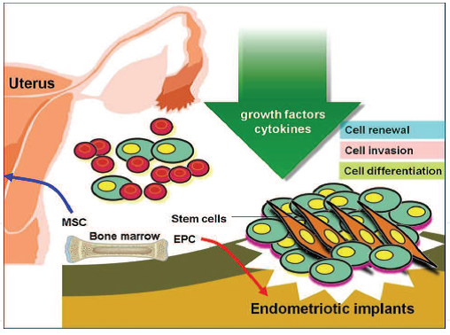 + Tế bào gốc trung mô (MSC: mesenchymal stem cell), tế bào nguyên bản nội mô (EPC: endothelial progenitor cell) từ tủy xương lưu thông tới nội mạc tử cung và thành MSC nội mạc tử cung, nhưng các MSC này cũng có thể theo đường máu, bạch huyết lưu thông vào ổ bụng, dưới ảnh hưởng của môi trường vi thể trong ổ bụng, biệt hóa thành các tế bào chức năng nội mạc tử cung gây ra bệnh lý LNMTC.