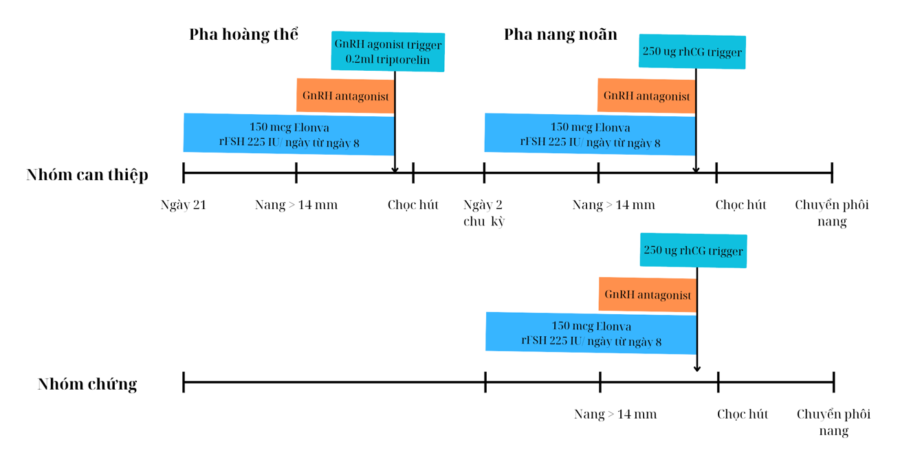 Ở nhóm chứng, bệnh nhân được kích thích buồng trứng một lần duy nhất bắt đầu vào ngày hai chu kỳ kinh. Phôi tạo ra sẽ được dùng để chuyển phôi tươi. Phác đồ chi tiết của hai nhóm được thể hiện ở hình 1.