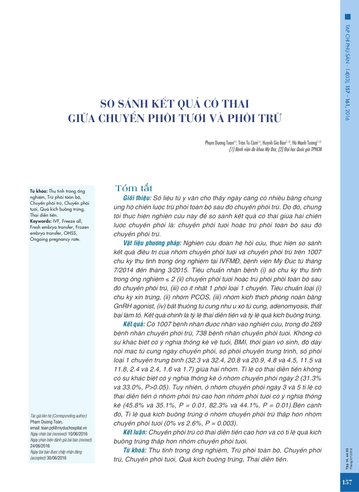 So sánh kết quả có thai giữa chuyển phôi tươi và phôi trữ 26/09/2016 44 Lượt xem Từ khóa: So sánh kết quả có thai giữa chuyển phôi tươi và phôi trữ Chia sẻ bài viết: Zalo