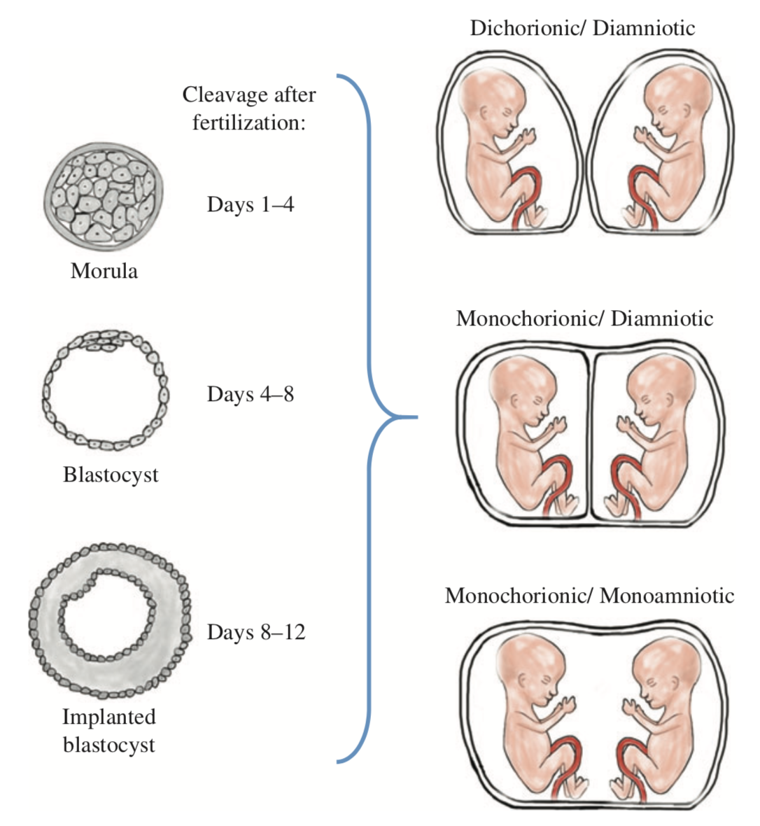 Nếu sự chia tách phôi xảy ra sớm từ ngày sau khi thụ tinh đến phôi ngày 4 sẽ tạo thành song thai cùng trứng hai túi thai - hai bánh nhau, chiếm khoảng 20 – 30% ở thai tự nhiên. Nếu sự chia tách xảy ra ở giai đoạn phôi nang đên ngày 8 sau thụ tinh sẽ tạo thành song thai cùng trứng hai túi thai – một bánh nhau, chiếm khoảng 70 – 75% trường hợp. Nếu sự chia tách xảy ra sau 1 – 2 tuần sẽ tạo thành song thai cùng trứng một túi thai – một bánh nhau, chiếm khoảng 1 – 2%.