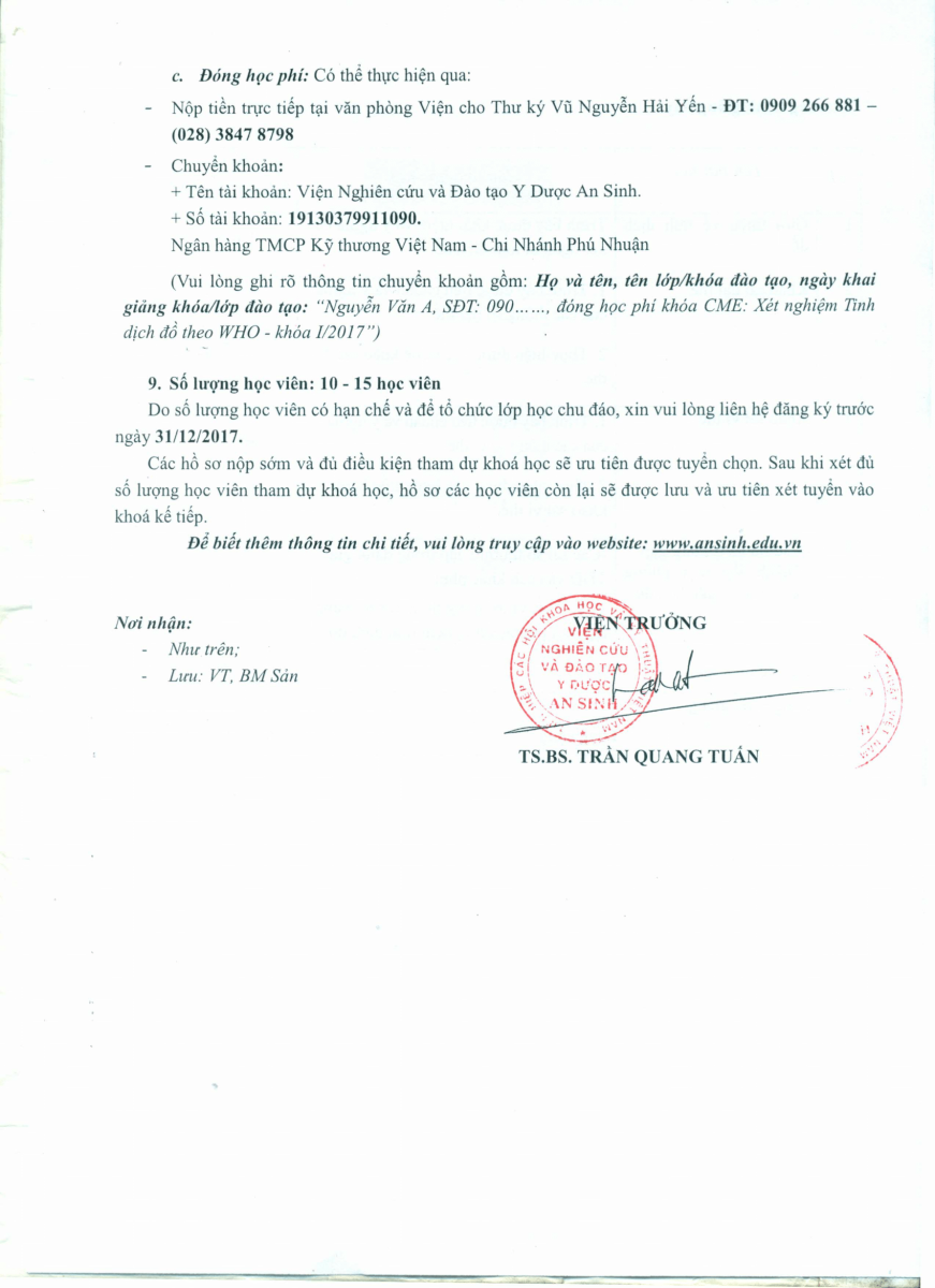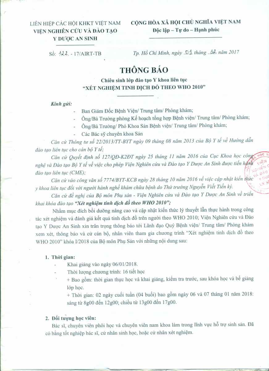 Thông báo Chiêu sinh lớp đào tạo Y khoa liên tục "Xét nghiệm tinh dịch đồ theo WHO 2010" 05/12/2017 47 Lượt xem Khai giảng ngày 06/1/2018 - Thời lượng 16 tiết học tại Viện nghiên cứu và đào tạo Y Dược An Sinh, Số 10, Trần Huy Liệu, Q. Phú Nhuận, TP. HCM. Từ khóa: Xét nghiệm tinh dịch đồ theo WHO 2010 Chia sẻ bài viết: Zalo