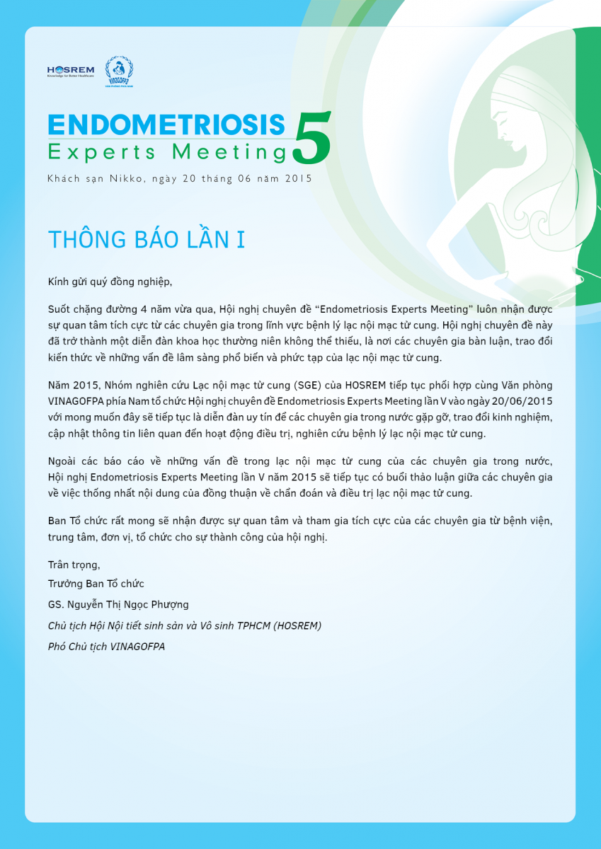 Thông báo lần I - ENDOMETRIOSIS Experts Meeting 5 12/05/2015 32 Lượt xem (Khách sạn Nikko - Ngày 20 tháng 6 năm 2015) Hội nghị chuyên đề "Endometriosis Experts Meeting" luôn nhận được sự quan tâm tích cực từ các chuyên gia trong lĩnh vực bệnh lạc nội mạc tử cung. Từ khóa: ENDOMETRIOSIS Experts Meeting 5 Chia sẻ bài viết: Zalo