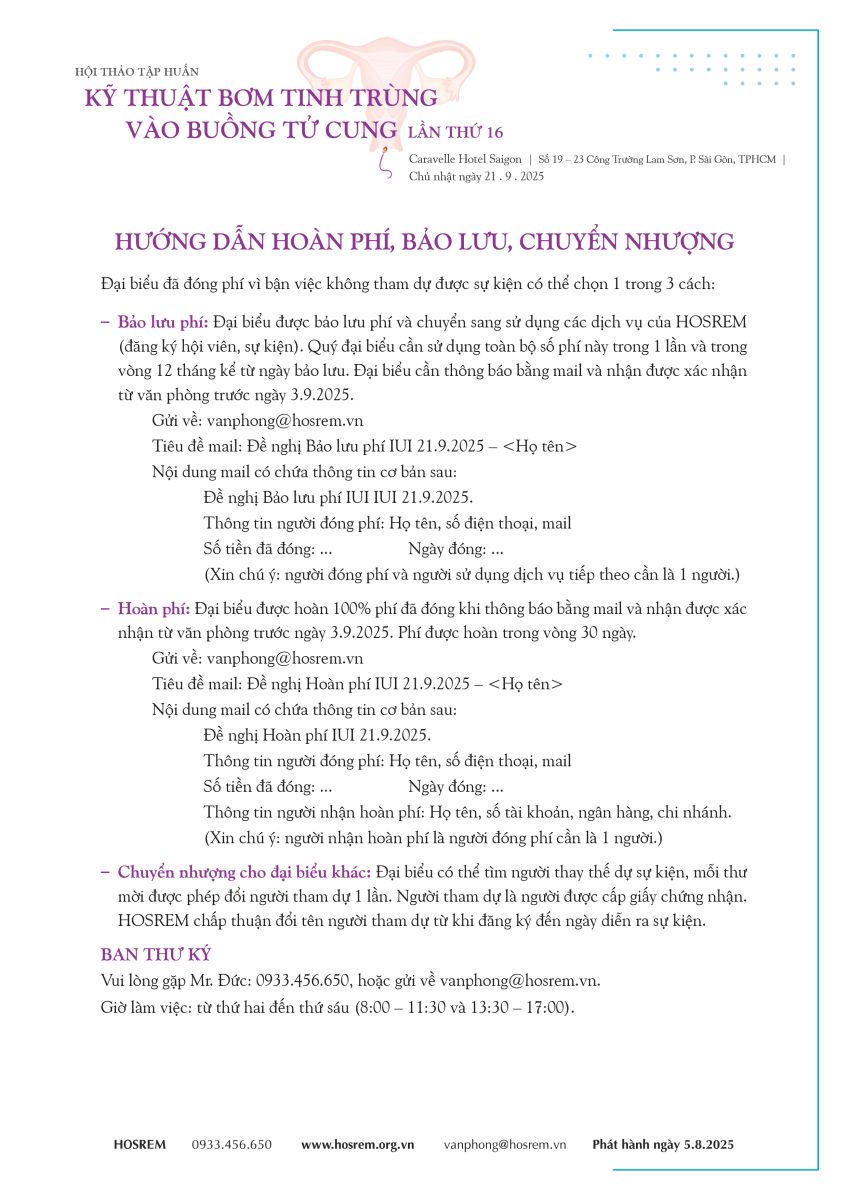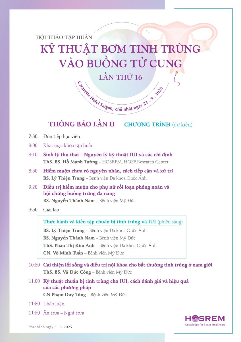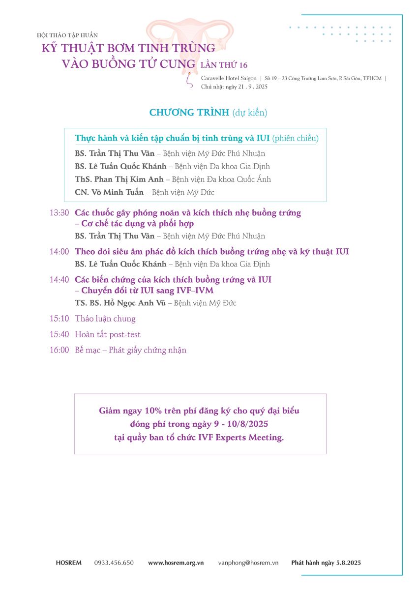 Thông báo lần II - IUI 05/08/2025 68 Lượt xem Chủ nhật ngày 21 . 9 . 2025, Caravelle Hotel Saigon, Số 19 - 23 Công Trường Lam Sơn, Phường Sài Gòn, TPHCM Hội thảo tập huấn BƠM TINH TRÙNG VÀO BUỒNG TỬ CUNG lần thứ 16 Chủ nhật ngày 21 . 9 . 2025 Caravelle Hotel Saigon, Số 19 - 23 Công Trường Lam Sơn, Phường Sài Gòn, TPHCM (Cập nhật 5 . 8 . 2025) Từ khóa: IUIhội thảo Chia sẻ bài viết: Zalo