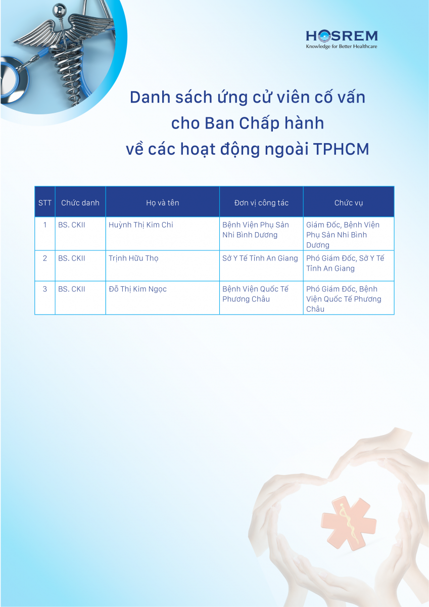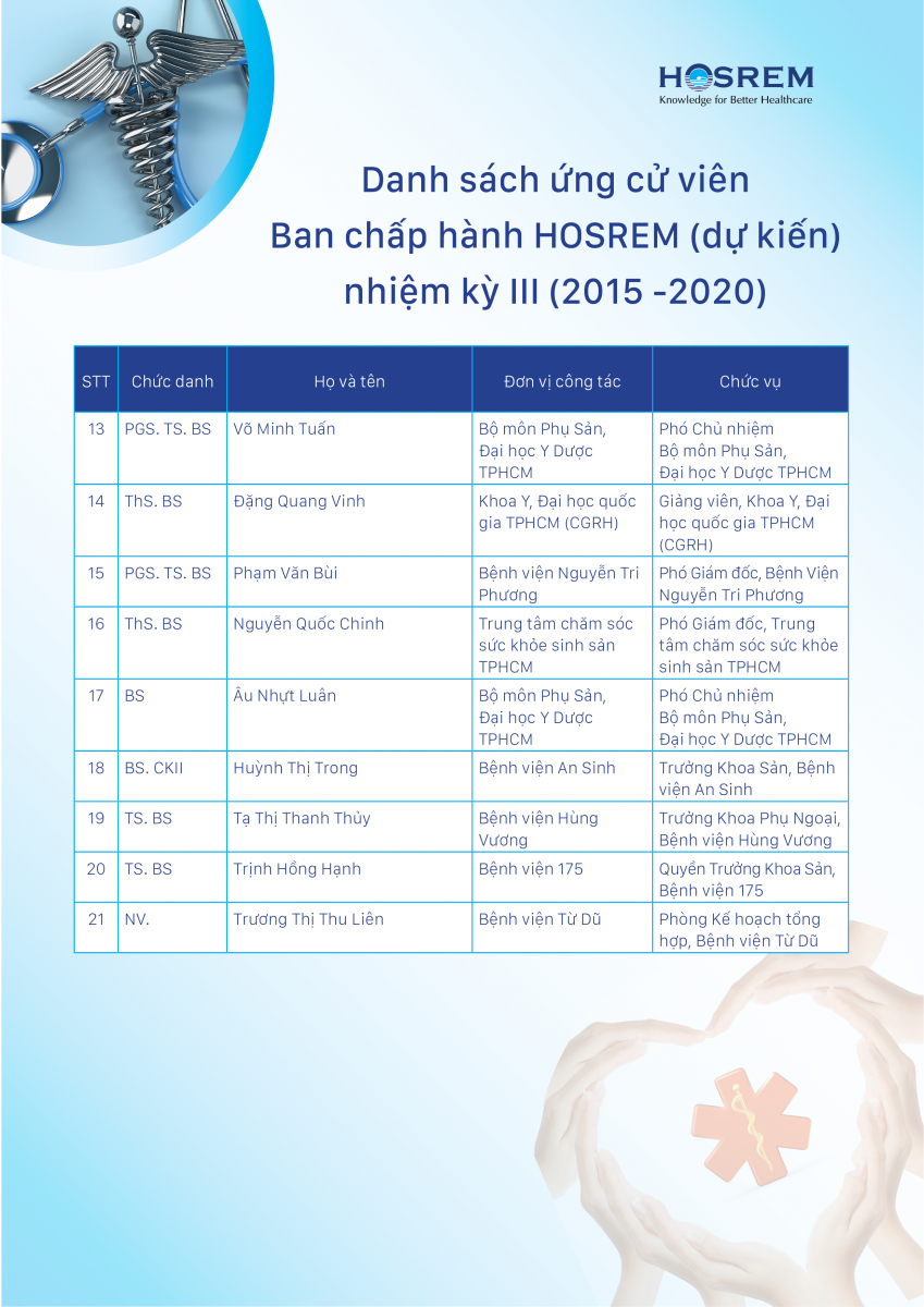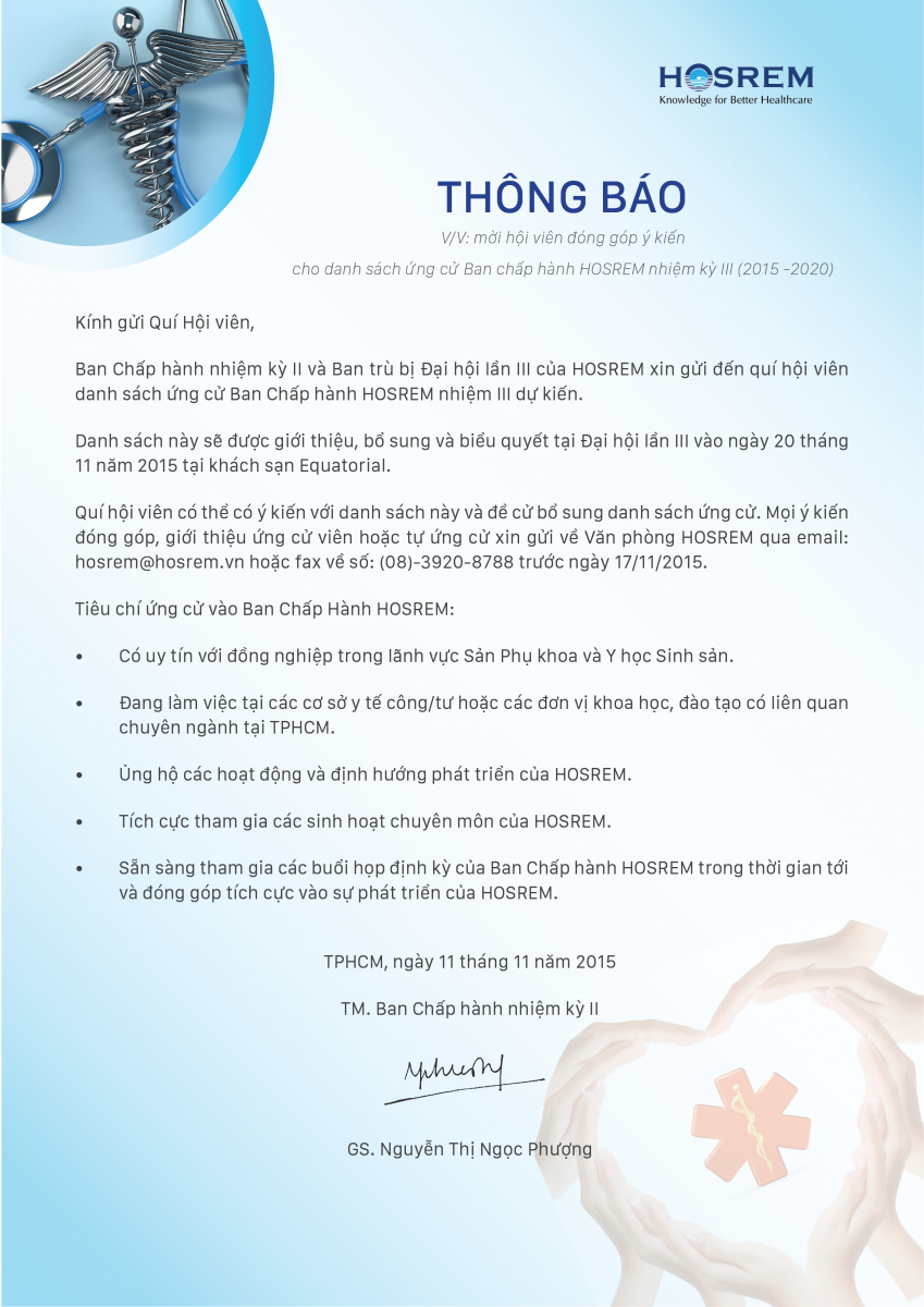 Thông báo v/v mời đóng góp ý kiến danh sách ứng cử BCH Hosrem nhiệm kỳ III (2015-2020) 12/11/2015 34 Lượt xem Danh sách này sẽ được giới thiệu, bổ sung và biểu quyết tại Đại hội lần III ngày 20 tháng 11 năm 2015 tại khách sạn Equatorial. Từ khóa: BCH Hosrem Chia sẻ bài viết: Zalo
