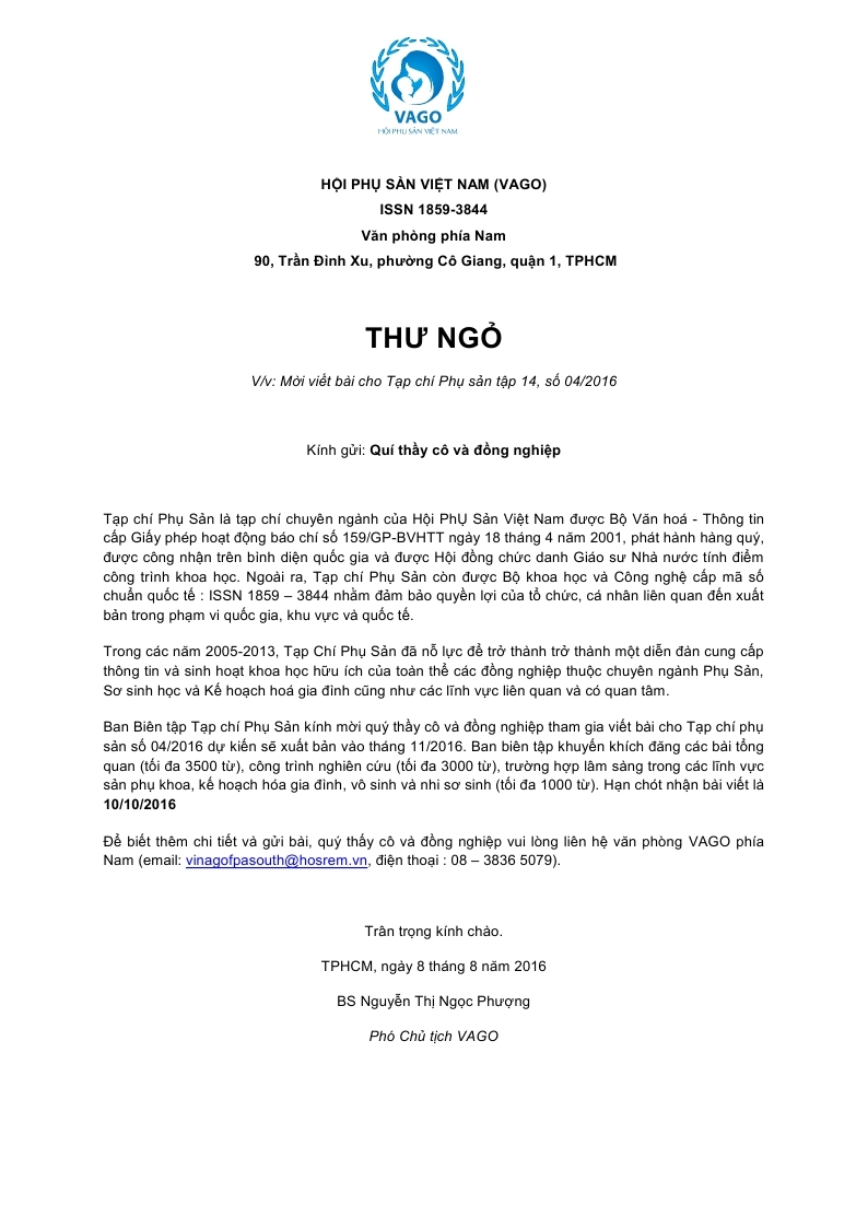 Thư ngỏ mời viết bài cho Tạp chí Phụ sản tập 14, số 04/2016 24/08/2016 59 Lượt xem Tạp chí Phụ Sản là tạp chí chuyên ngành của Hội PhỤ Sản Việt Nam được Bộ Văn hoá - Thông tin cấp Giấy phép hoạt động báo chí số 159/GP-BVHTT ngày 18 tháng 4 năm 2001 Từ khóa: Thư ngỏ mời viết bài cho Tạp chí Phụ sản tập 14số 04/2016 Chia sẻ bài viết: Zalo