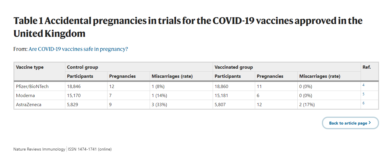 Một số nghiên cứu lâm sàng đã đặt vấn đề liệu vaccine COVID-19 có tác động xấu tới khả năng sinh sản hay không. Các nghiên cứu về độc tính đối với sự phát triển và sinh sản cho thấy rằng vaccine không gây hiện tượng vô sinh trên động vật gặm nhấm hoặc gây hại cho chuột con nếu được tiêm trong thời kỳ mang thai. Cũng từng có ý tưởng về cách vaccine ảnh hưởng đến quá trình mang thai ở người từ dữ liệu trên những người tình nguyện mang thai trong quá trình thử nghiệm lâm sàng. Mặc dù người mang thai đã bị loại khỏi các thử nghiệm và những người tham gia được yêu cầu tránh mang thai, nhưng thực tế đã có 57 trường hợp mang thai đã xảy ra trong các thử nghiệm của ba loại vaccine đã được phê duyệt ở Anh cho đến nay. Dữ liệu về số ca có thai và diễn tiến thai kỳ được tóm tắt trong Bảng 1. Không có sự khác biệt đáng kể về tỷ lệ mang thai ngoài ý muốn ở nhóm được tiêm chủng so với nhóm đối chứng, điều này cho thấy rằng vaccine không có tác dụng ngừa thai trên người. Tương tự, tỷ lệ sẩy thai là tương đương giữa các nhóm, cho thấy không có tác dụng bất lợi của việc tiêm phòng trong thời kỳ đầu mang thai.