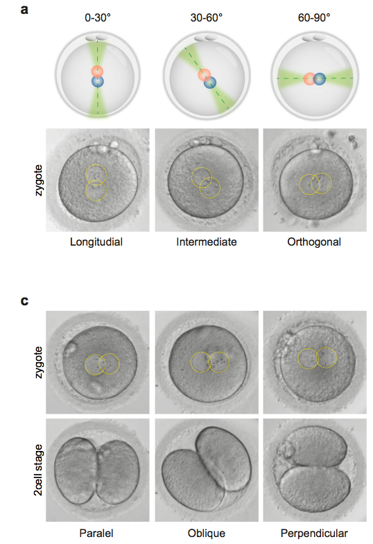 Chú thích: a: Sự định hướng của tiền nhân (PN) đối với thể cực (polar body - PB). c: Các mặt phẳng phân chia tế bào từ giai đoạn hợp tử sang 2 tế bào, so với trục PN (đường nối hai tiền nhân). Song song (parallel): Mặt phẳng phân chia song song với trục PN, Xiên (oblique): Mặt phẳng phân chia xiên so với trục PN, và vuông góc (perpendicular): Mặt phẳng phân chia vuông góc với trục PN.