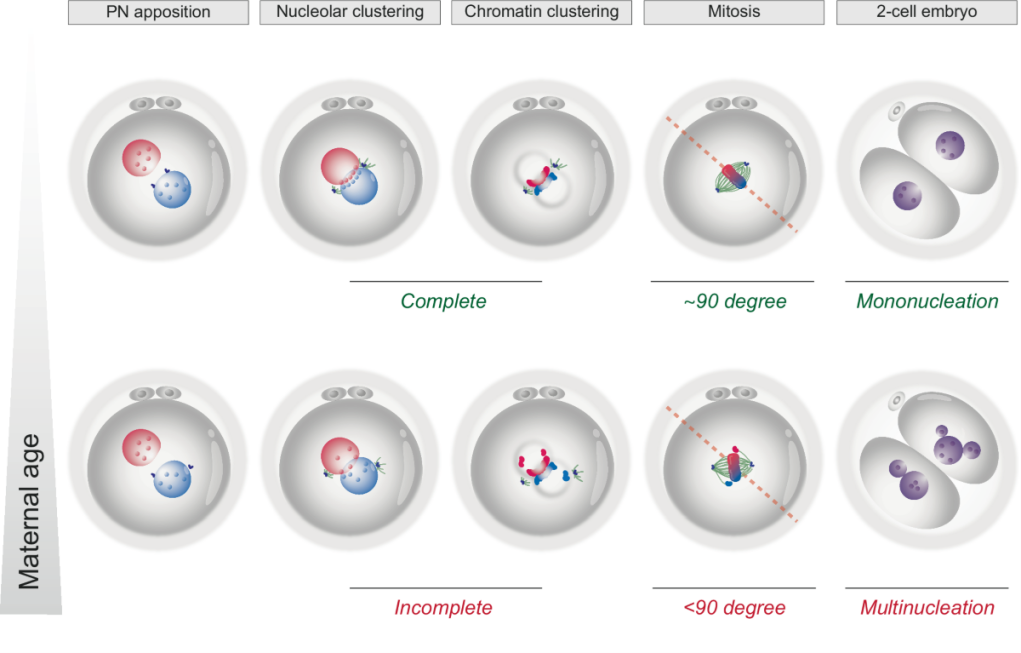 Chú thích: Hàng trên mô tả sự di chuyển đến gần của các tiền nhân (PN apposition) với sự sắp xếp liền kề của các hạch nhân (Nucleolar clustering) và nhiễm sắc chất (chromatin clustering) một cách hoàn chỉnh (complete); các trung thể tổ chức lắp ráp thoi vô sắc nguyên phân vuông góc với các tiền nhân, do đó thúc đẩy sự phân tách NST chính xác, tạo ra 2 tế bào con đơn nhân (mononucleation). Hàng dưới mô tả sự rối loạn điều chỉnh kiểm soát không gian trong quá trình nguyên phân đầu tiên ở phôi từ noãn người mẹ lớn tuổi: các PN đến gần nhau nhưng sự sắp xếp các hạch nhân không hoàn chỉnh (incomplete) cho thấy định hướng không gian suy giảm nên thoi vô sắc được lắp ráp với góc lệch <90o, dẫn đến phân tách NST không đồng đều, tạo ra tế bào con có nhiều nhân (multinucleation) hoặc số lượng NST bất thường.