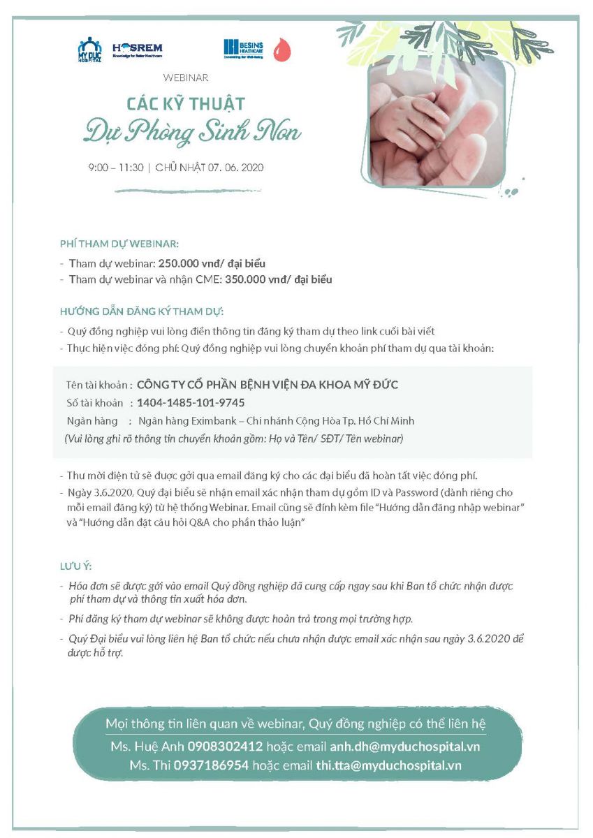 Hiểu biết về sinh non và các biện pháp dự phòng sinh non đến nay vẫn chưa rõ ràng và có nhiều tranh luận. Thông tin về sinh non và dự phòng sinh non hiện nay được cập nhật liên tục trên thế giới. Do đó, việc tổ chức các diễn đàn khoa học chia sẻ những kiến thức cơ bản và cập nhật thông tin mới về chủ đề này là rất cần thiết. Đơn vị đào tạo y khoa liên tục (CME) Bệnh viện Mỹ Đức phối hợp với HOSREM tổ chức webinar chủ đề Các kỹ thuật dự phòng sinh non vào ngày 07.06.2020