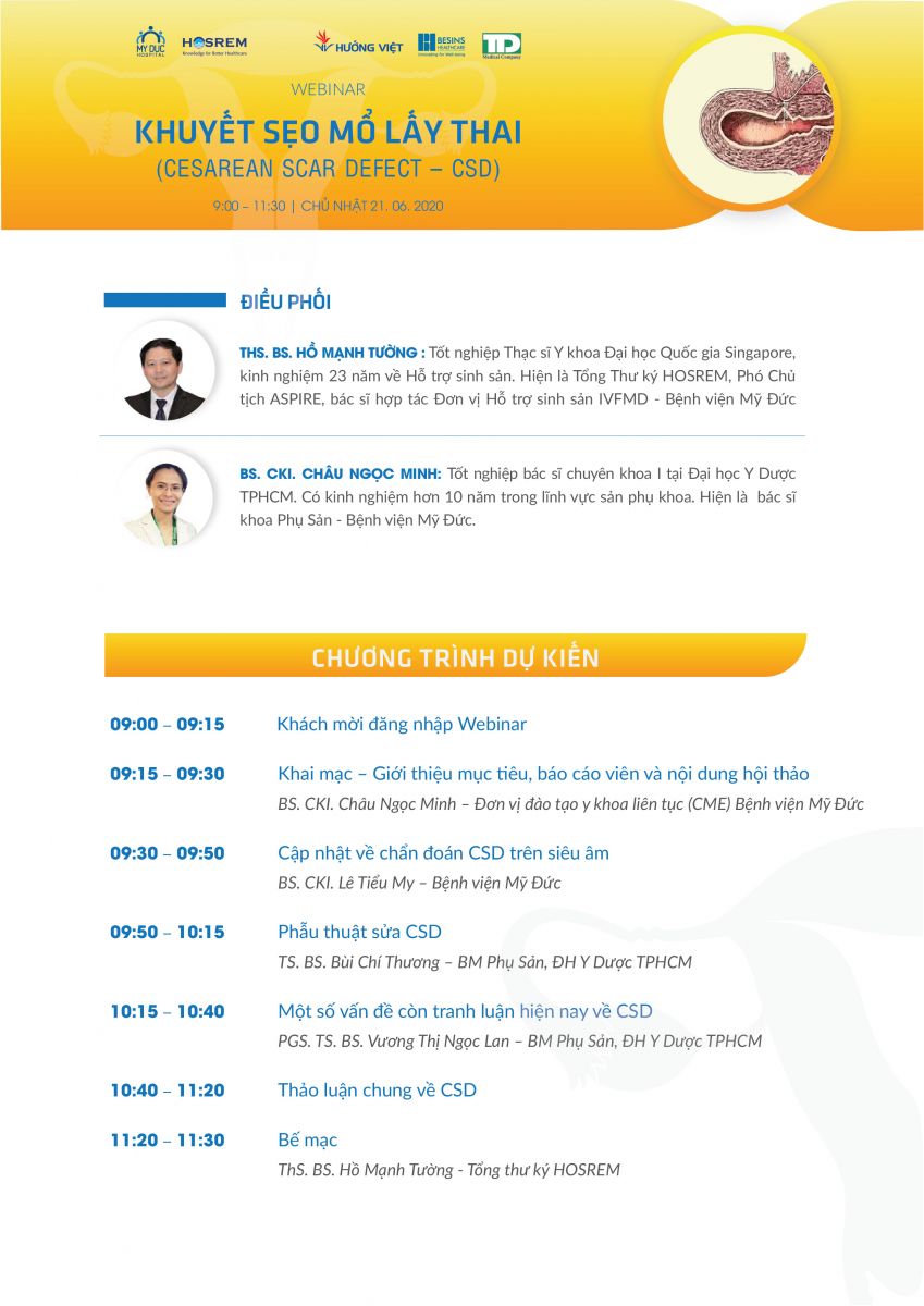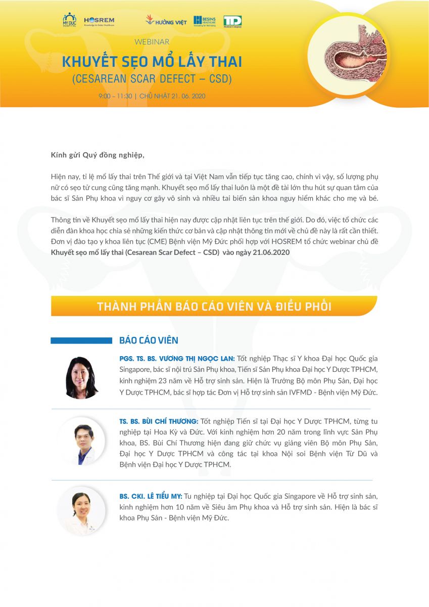 Hiện nay, tỉ lệ mổ lấy thai trên Thế giới và tại Việt Nam vẫn tếp tục tăng cao, chính vì vậy, số lượng phụ nữ có sẹo tử cung cũng tăng mạnh. Khuyết sẹo mổ lấy thai luôn là một đề tài lớn thu hút sự quan tâm của bác sĩ Sản Phụ khoa vì nguy cơ gây vô sinh và nhiều tai biến sản khoa nguy hiểm khác cho mẹ và bé. Thông tn về Khuyết sẹo mổ lấy thai hiện nay được cập nhật liên tục trên thế giới. Do đó, việc tổ chức các diễn đàn khoa học chia sẻ những kiến thức cơ bản và cập nhật thông tn mới về chủ đề này là rất cần thiết. Đơn vị đào tạo y khoa liên tục (CME) Bệnh viện Mỹ Đức phối hợp với HOSREM tổ chức webinar chủ đề Khuyết sẹo mổ lấy thai (Cesarean Scar Defect – CSD) vào ngày 21.06.2020