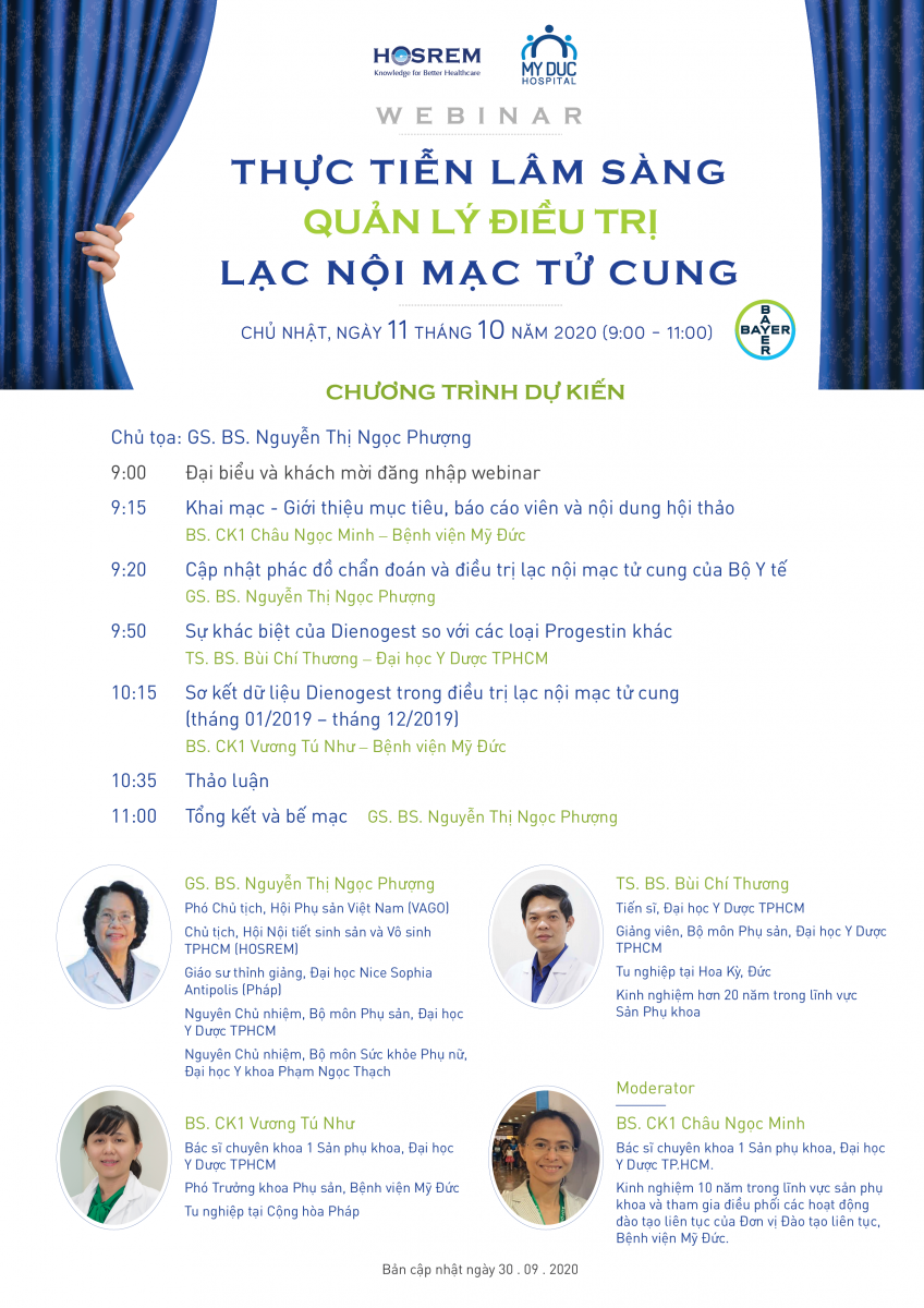 Cảm ơn Quý đồng nghiệp đã quan tâm đến webinar "THỰC TIỄN LÂM SÀNG QUẢN LÝ ĐIỀU TRỊ LẠC NỘI MẠC TỬ CUNG" sẽ được diễn ra vào ngày 11.10.2020 của Hội Nội tiết sinh sản và Vô sinh TPHCM (HOSREM) và Đơn vị Đào tạo Y khoa liên tục (CME) Bệnh viện Mỹ Đức tổ chức, với sự tài trợ của Công ty BAYER.